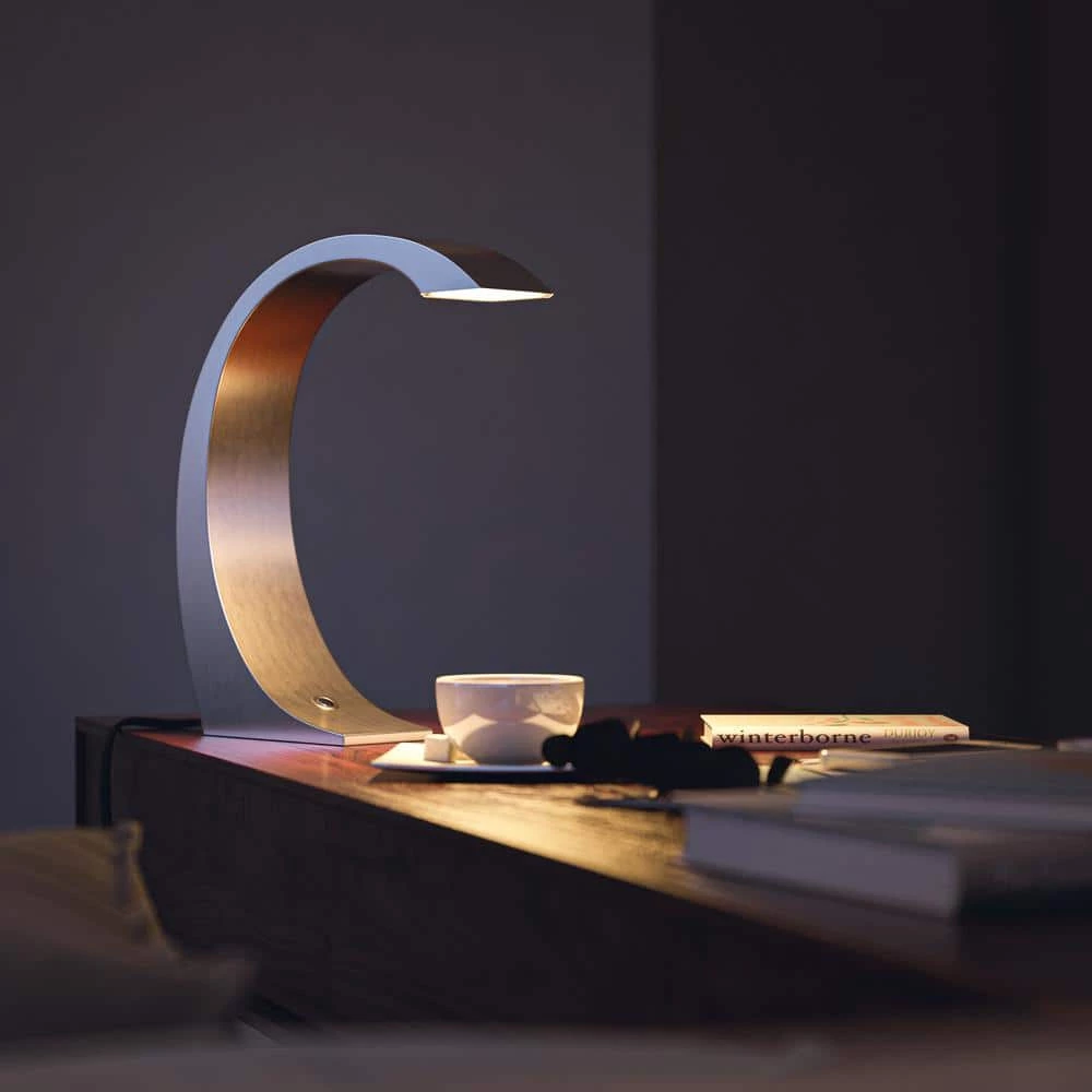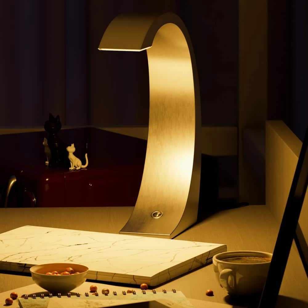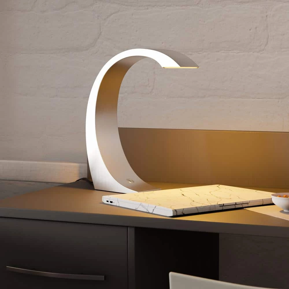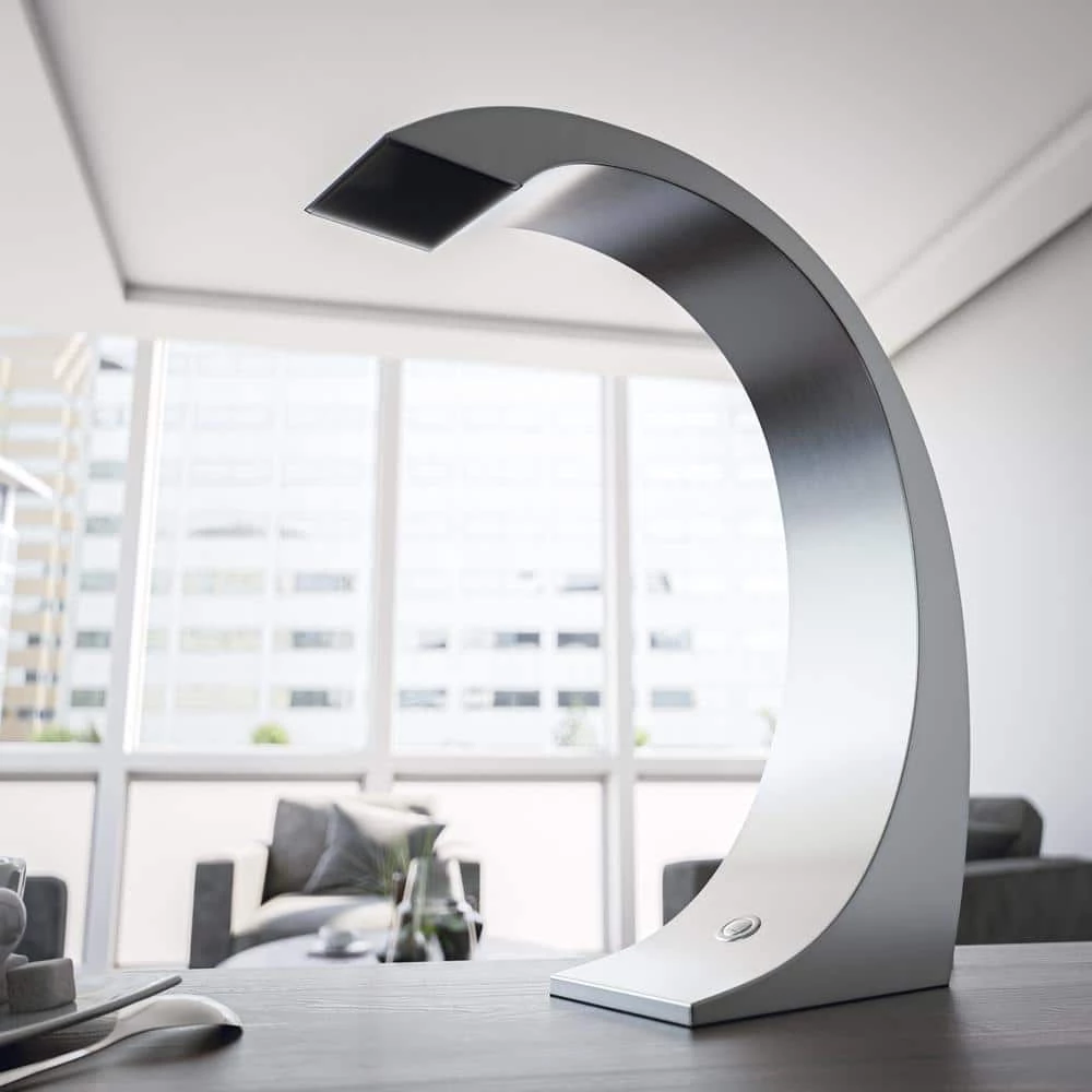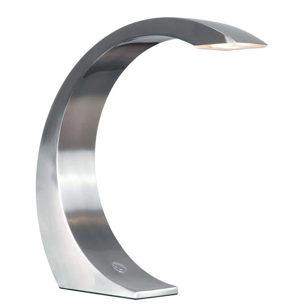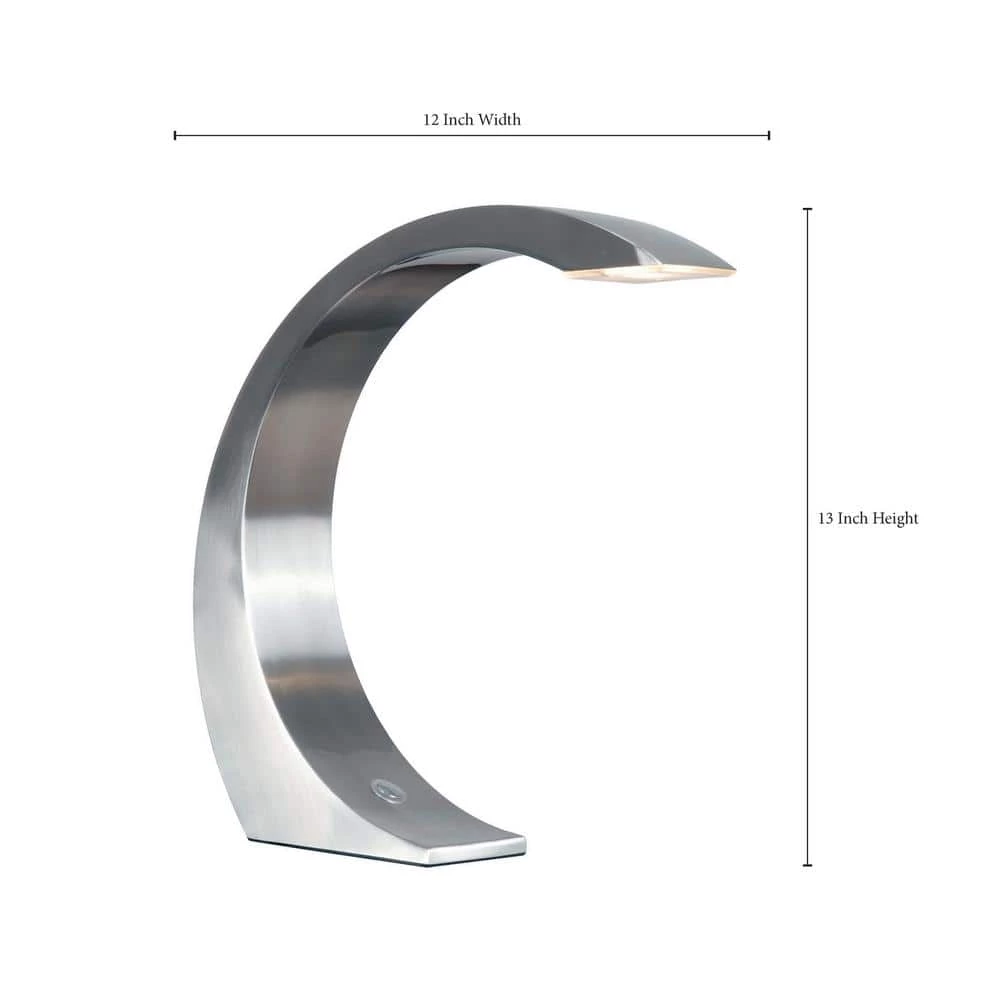 Inspired by futuristic science fiction movies, this LED desk lamp encompasses the style, tone, and sleekness of a modern art piece created in the distant future. Standing – or better yet, elegantly arching at 13 inches in height, this contemporary styled desk lamp finished in brushed steel carries a much sought after dark and mysterious vibe. With futuristic style comes futuristic technology – this desk lamp is powered by three (3) cool and vivid 1-Watt LED bulbs, these energy efficient beacons of light will remain bright and crisp through 20 years of use. Adding an extra layer of modern chic is the metallic dimmer switch found at the base of this contemporary desk lamp – while the lamp is in the off position, a glowing blue halo glows around the dimmer button…presenting an irresistible urge to turn on this sculpted art inspired desk lamp.