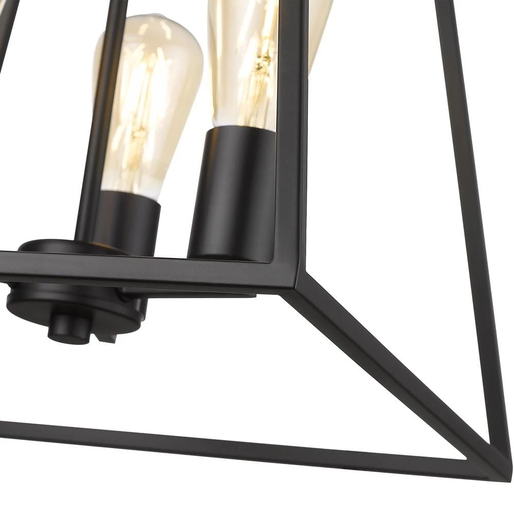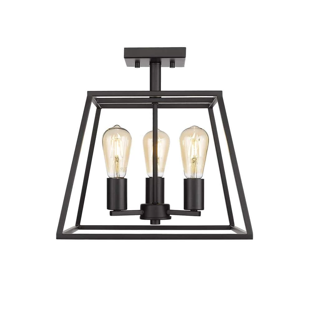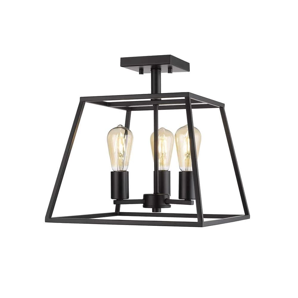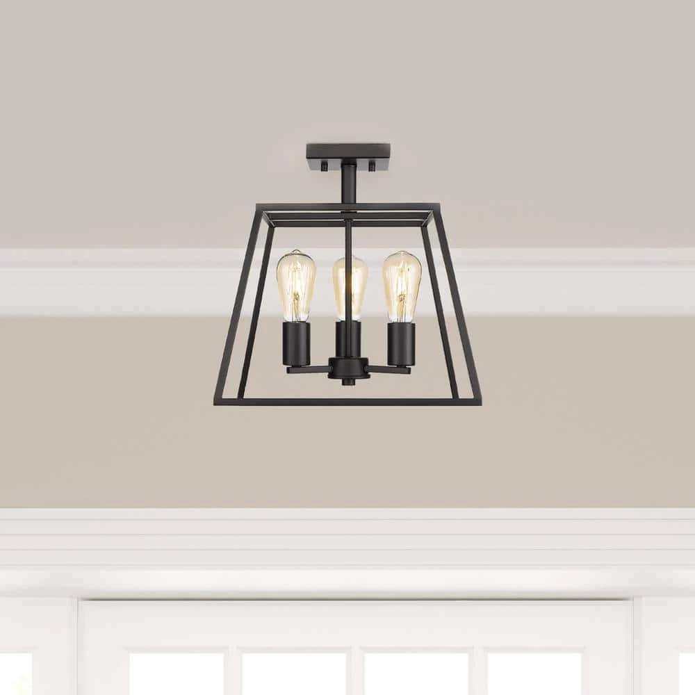 - 13.78 in. W semi-flush mount ceiling fixture with straight edges and a black iron finish, perfect for an industrial or farmhouse designed room