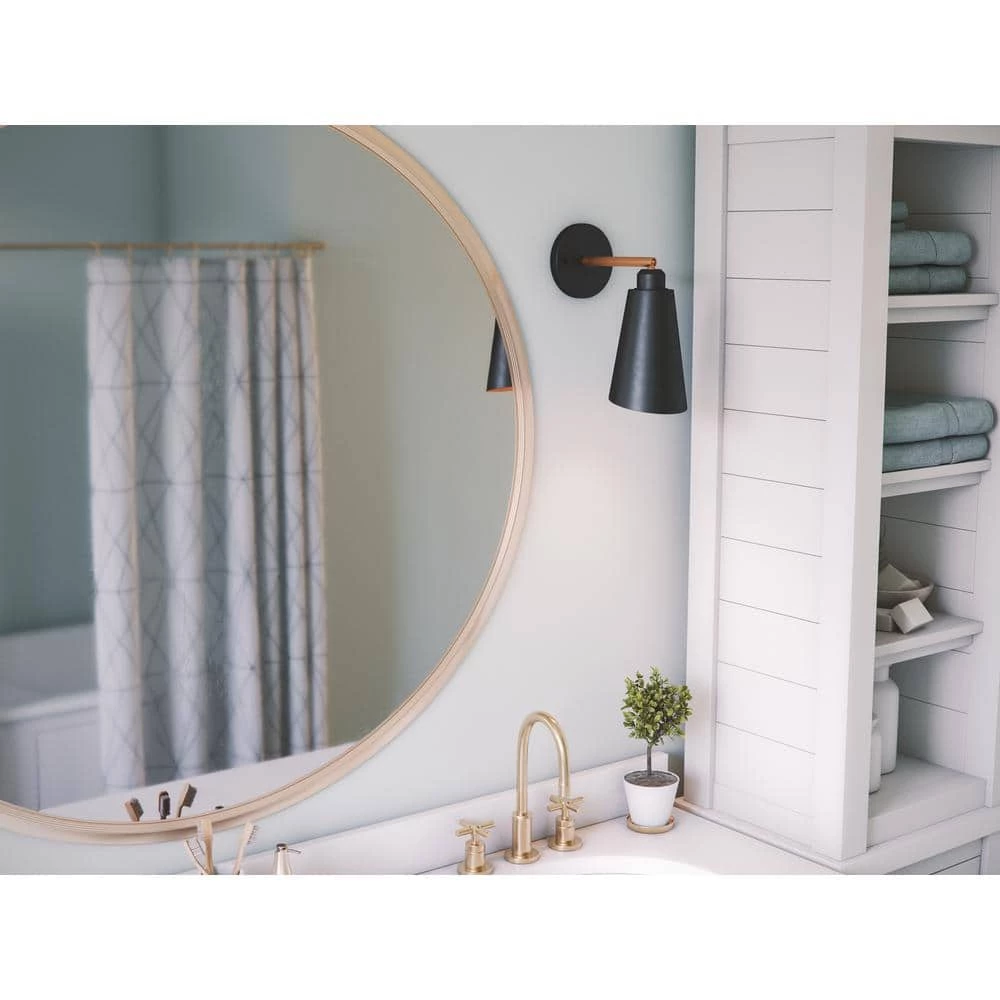 Black, brass and bold with Mid-Century Modern charm, this sleek Art Deco-inspired sconce shimmers and shines thanks to the brass inner finish of the flat black slant-cut shade. The clean-lines and unique slant cut of the shade gives this lamp a modern feel, perfect for an industrial urban loft or a retro-contemporary bedroom. This glamourous sconce provides strong, directional lighting perfect for use beside your bed or home office desk as a late-night reading light.