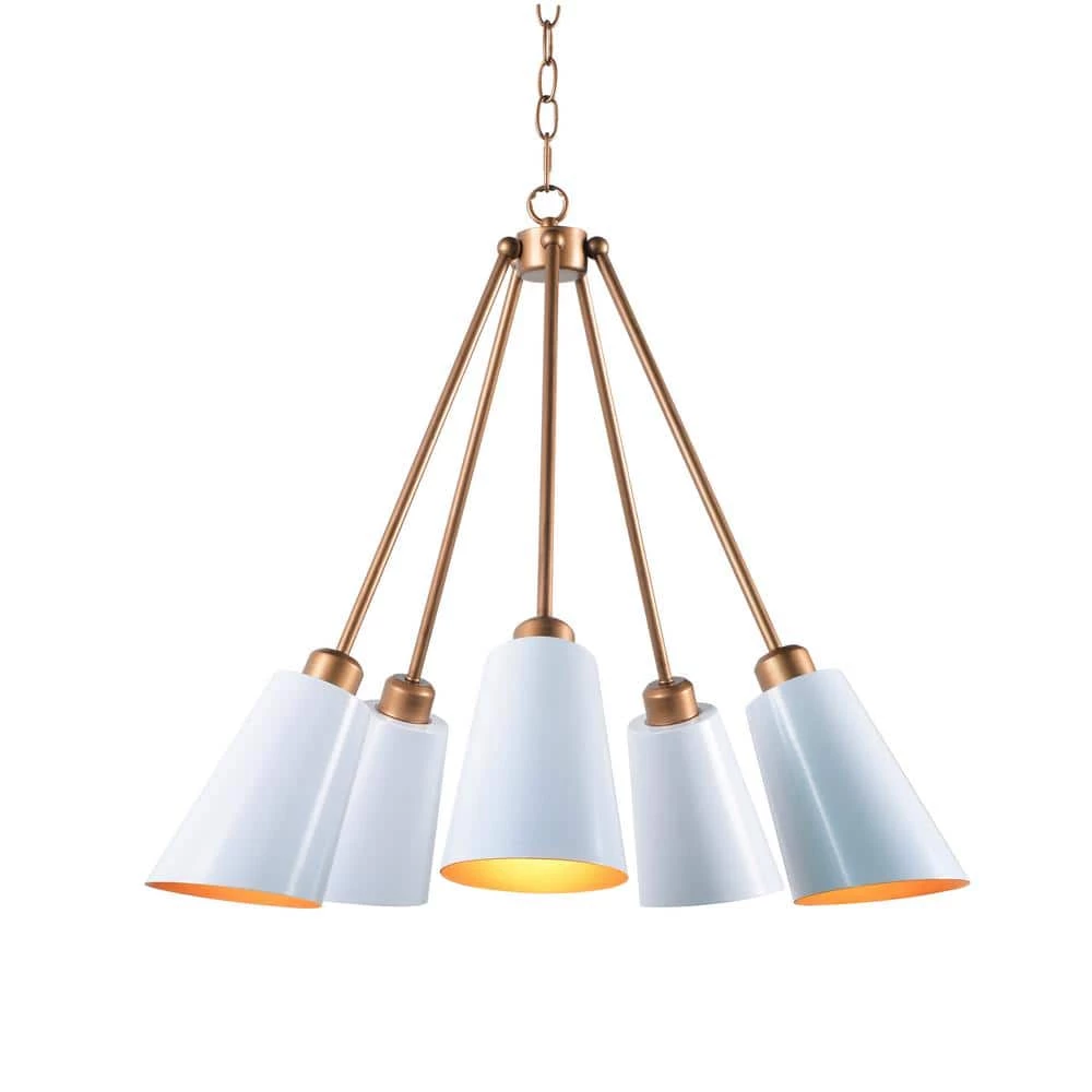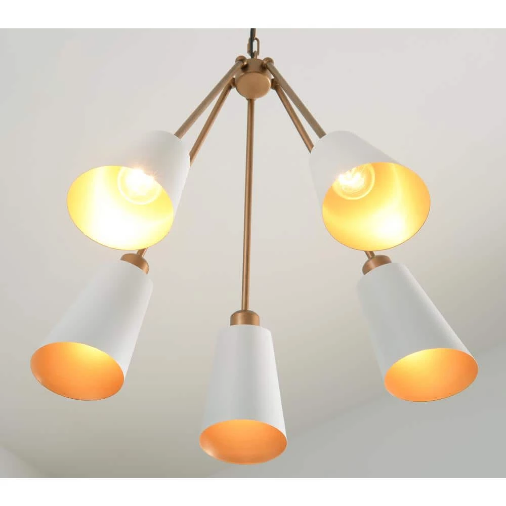 A tale of two finishes with a matte white and glimmering gold, this 5 light chandelier combines the clean-lined aesthetic of Art Deco design with a modern light and airy look perfect for your Mid-Century modern home. Install this stunning accent in your foyer to greet guests with the warm cascade of light, made brighter by the metallic gold lined slant cut shades. Hang in your vaulted ceiling dining room for a modern accent that complements your metallic table settings and luxe home decor. This posh chandelier will provide plenty of luxe style and bright lighting to your modern living spaces.