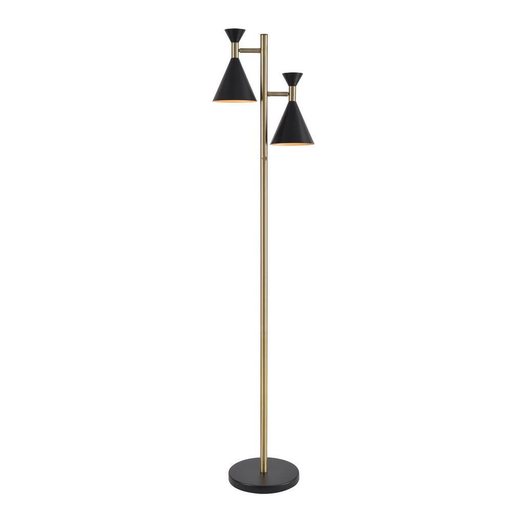 Find bold, trendy Mid-Century Modern style in the mysterious flat black and bright antique brass of this clean-lined tree lamp. Combining high style with functionality, two uniquely profiled metal shades can be swiveled and positioned to use as a superb reading light beside your peg leg tufted accent chair or to shed plenty of room-filling illumination from a bedroom corner. This tall two-light tree lamp provides the perfect amount of classy, retro style for your modern home.