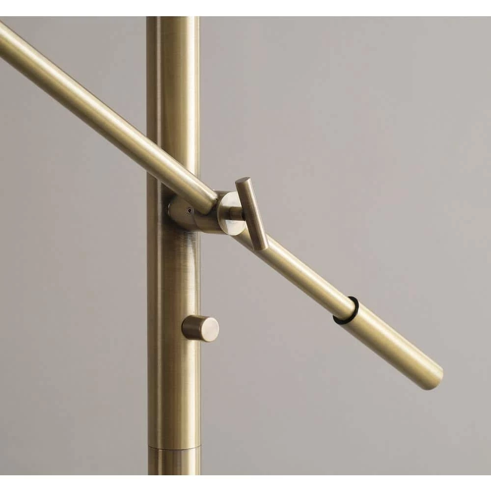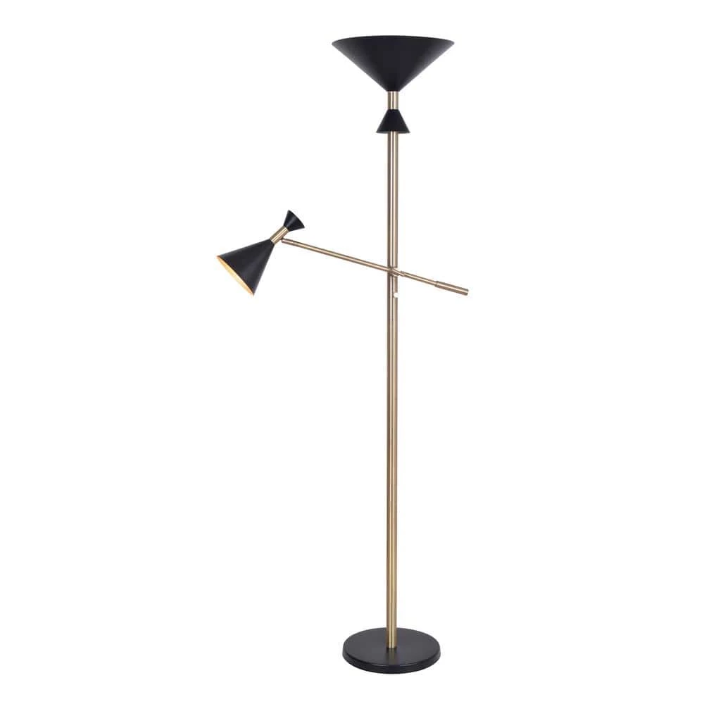 Find bold, trendy Mid-Century Modern style in the mysterious flat black and bright antique brass of this clean-lined floor lamp. Combining high style with functionality, an adjustable arm allows you to reposition a bonus reading light to illuminate your Mid-Century Modern accent chair while the main light fills the room with bright illumination. The conical shades, although finished in a matte black, have a brilliant antique brass lining, amplifying the light for an overall brighter effect perfect for living rooms, bedrooms and home offices. This 73 in. floor lamp provides the perfect amount of classy, retro style for your modern, contemporary, Mid-Century Modern, retro, glam or luxe-inspired home.