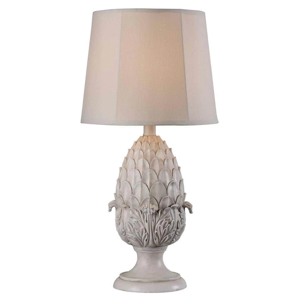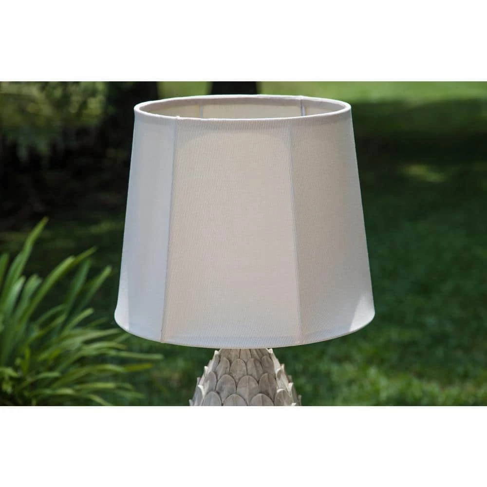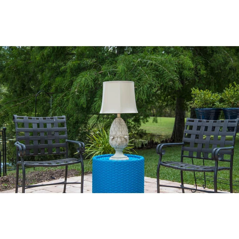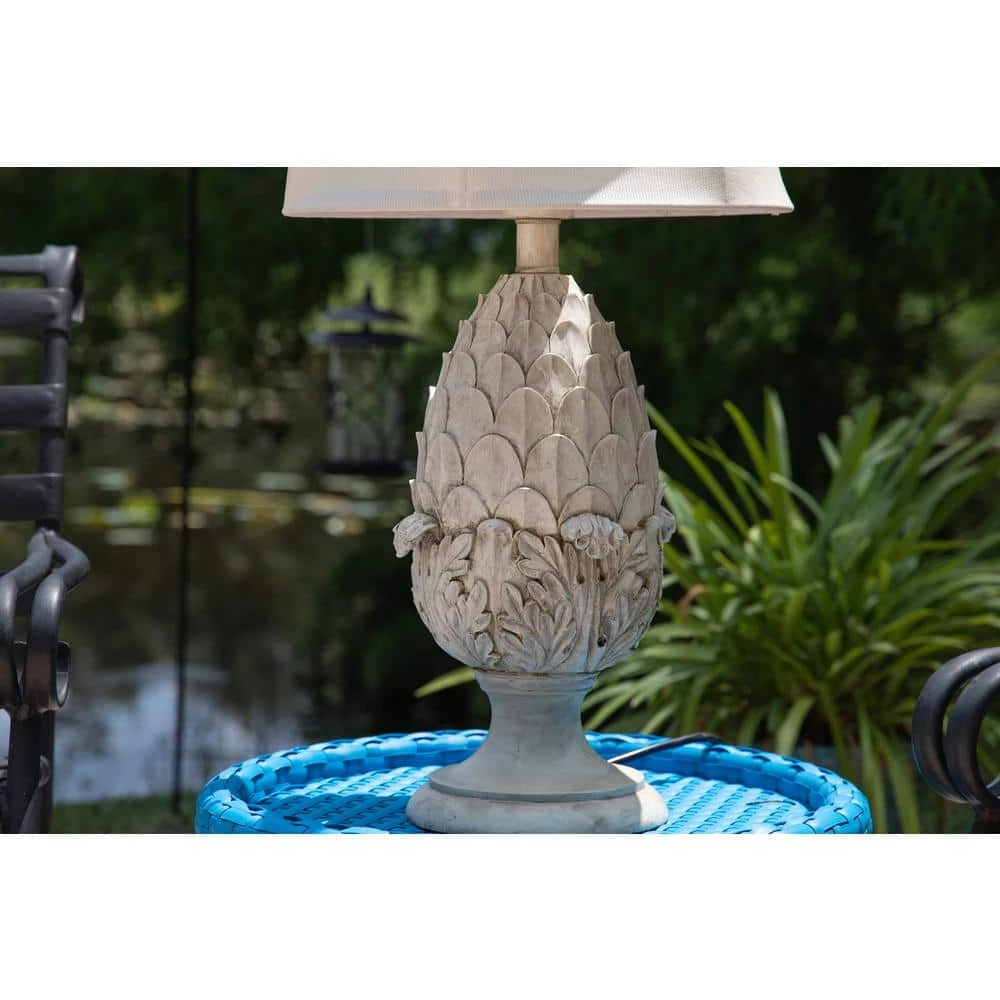 The handsome artichoke design of this roman white-finished outdoor table lamp is inspired by the classical carved designs of old-world Tuscany. This tall table lamp is the perfect accent on top of your outdoor living room end tables, serving as a transitional piece between the ornate, sculptural details of traditional, classic design and casual, trendy style. Topped with a weather-resistant off-white tapered shade, this lamp is the perfect companion piece for a shabby-chic patio table near your brightly colored garden.