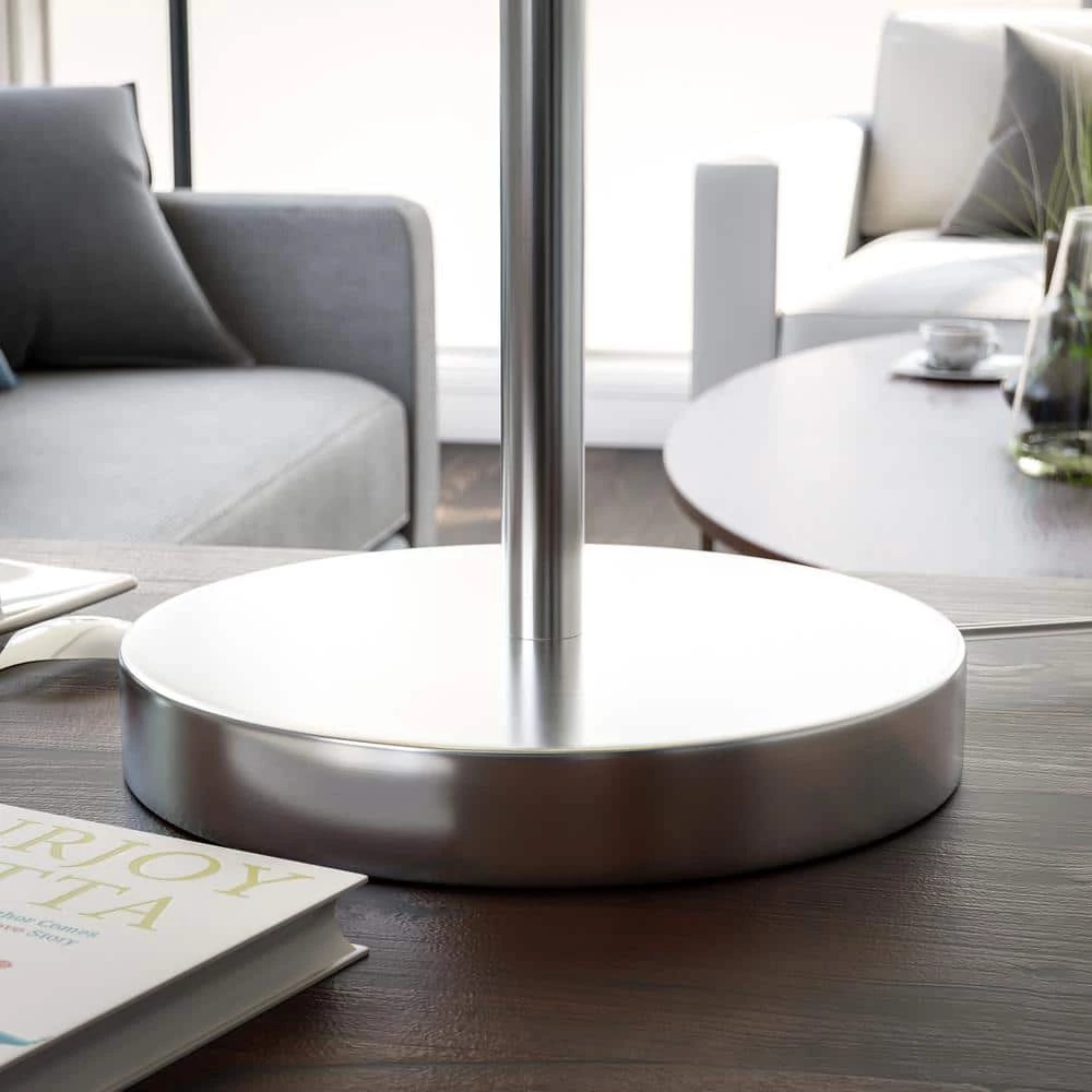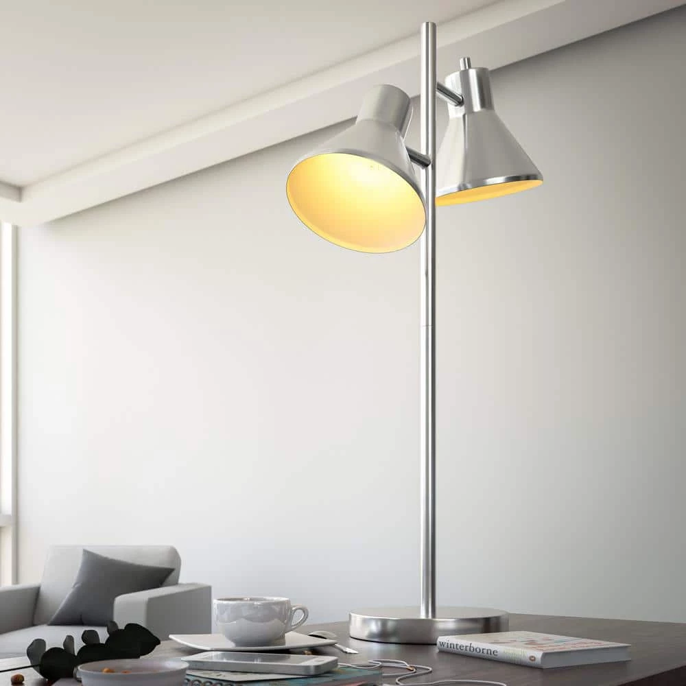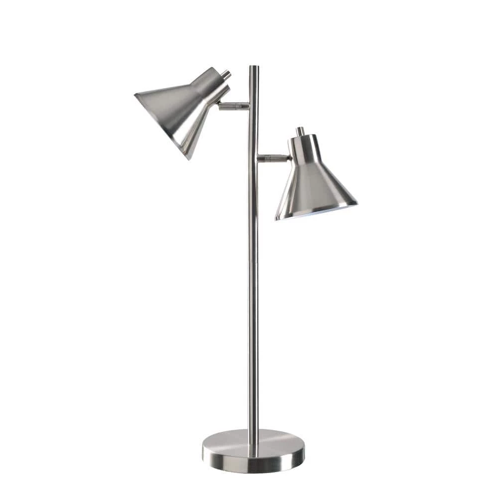 Double shades mean double the light At 30 in. tall, the Ash table lamp has a small footprint; making it perfect to sit on any size table or desk. The body of the lamp is simple, a round base supports the main rod that leads to 2 conical shades. A basic hinge allows you to turn either shade up and down to point the light in whatever direction you may need it. The Ash table lamp, in a brushed steel finish, would be perfect to angle upwards off the side table so that light can pointed in 2 different directions for multiple uses. With a clean and simple design, this lamp puts functionality and style together in a small package.