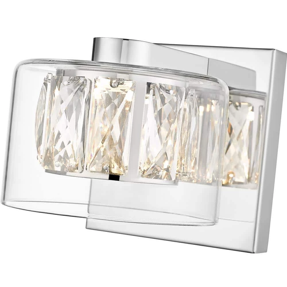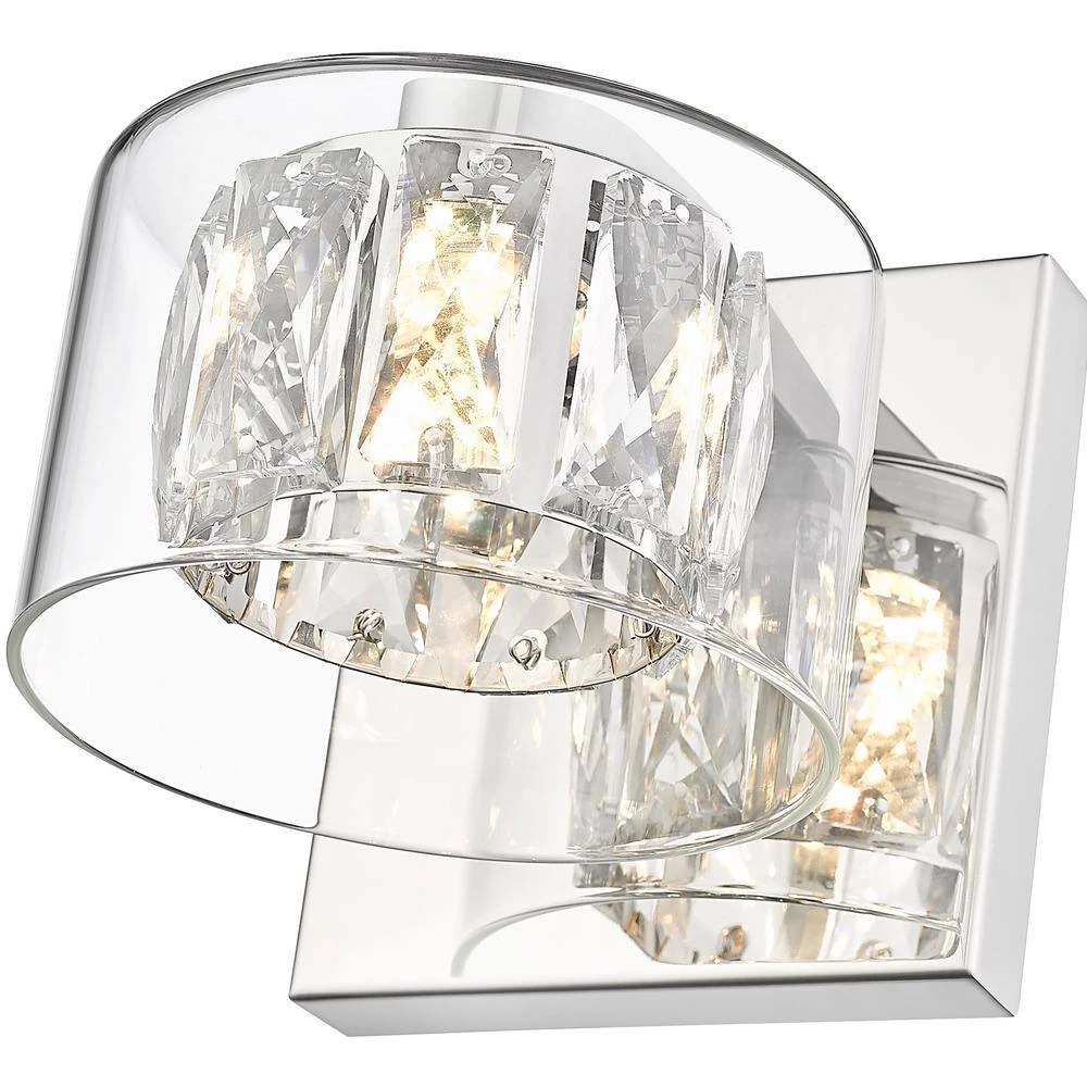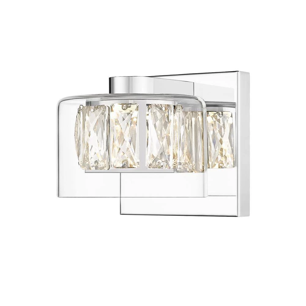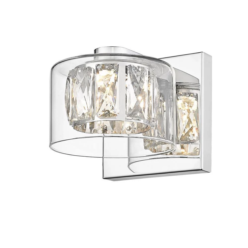 The OVE Decors 1-Light Aster Wall Sconce will light up your world. Featuring distinctive K9 crystals wrapped in a rounded, clear glass shade, it will cast a beautiful downward light and softly brighten up the room and charm guests thanks to its eye-catching details. The chrome-plated back panel has a mirror effect and multiplies the beauty of this unique fixture. Perfect for damp locations like the bathroom. Place one on each side of your bathroom mirror or vanity for the perfect finishing touch.