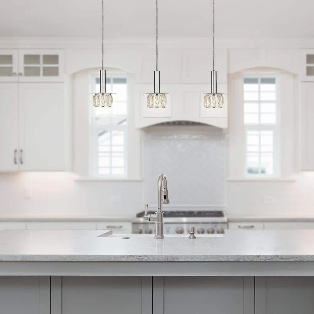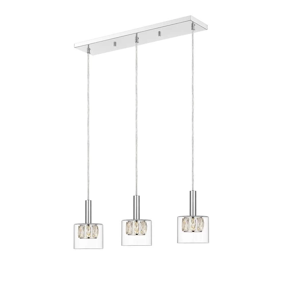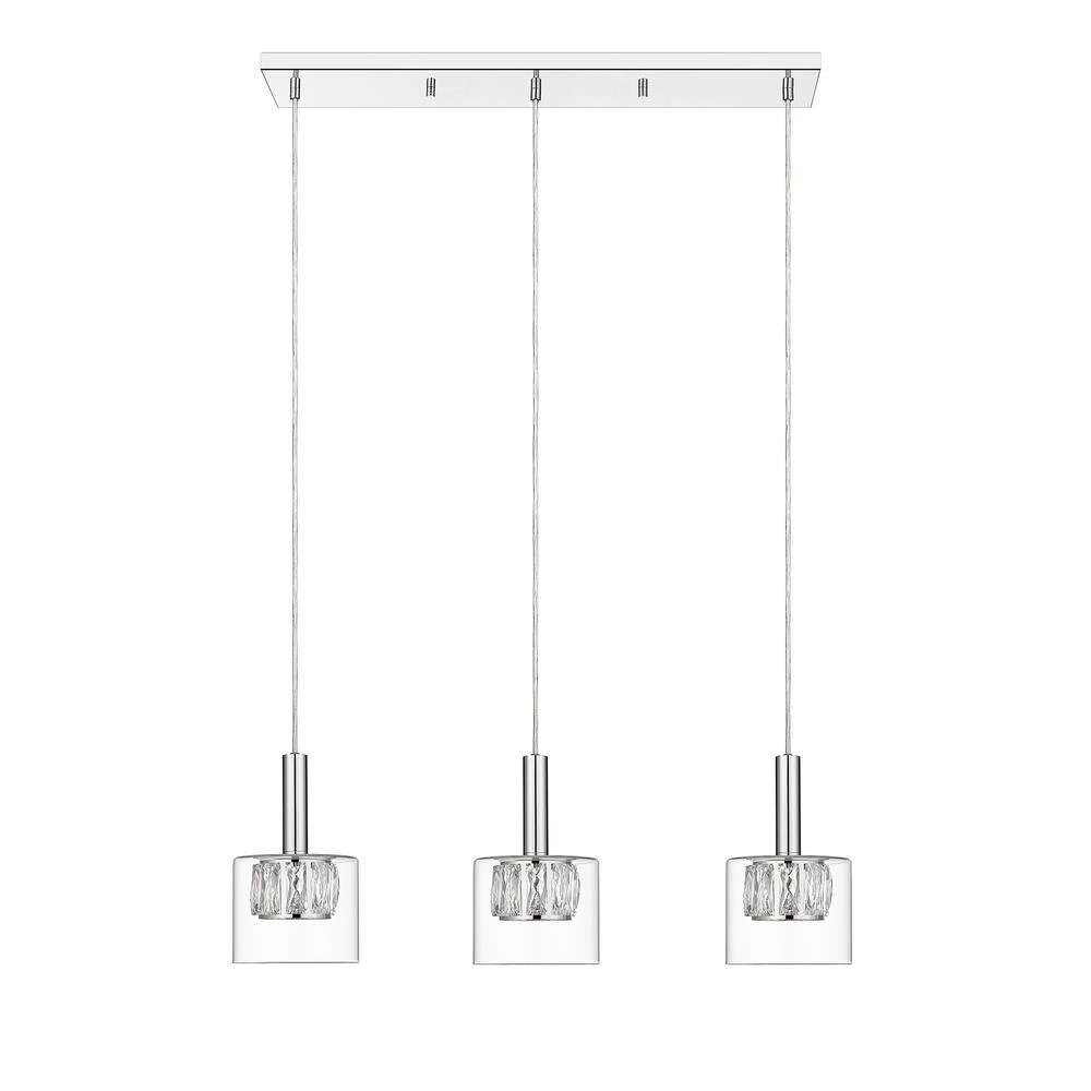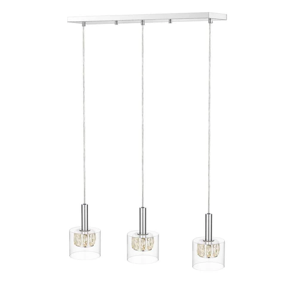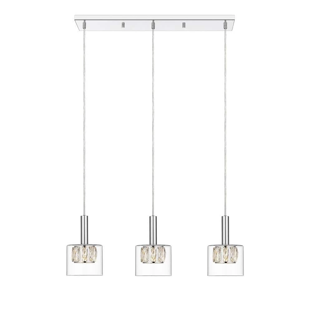 The Aster 3-light pendant light by OVE Decors is crystal clear. Elegant and functional, it will instantly glam up any living area around the house and add the perfect touch of sparkle above a staircase, dining room table or kitchen island. Suspended on beautiful clear trimmable wire cables, the three chandeliers create a sumptuous light display in the household and accommodates multiple ceiling heights for added customization. This model features a chrome finish and fully honors the OVE signature, combining refinement, durability and functionality.