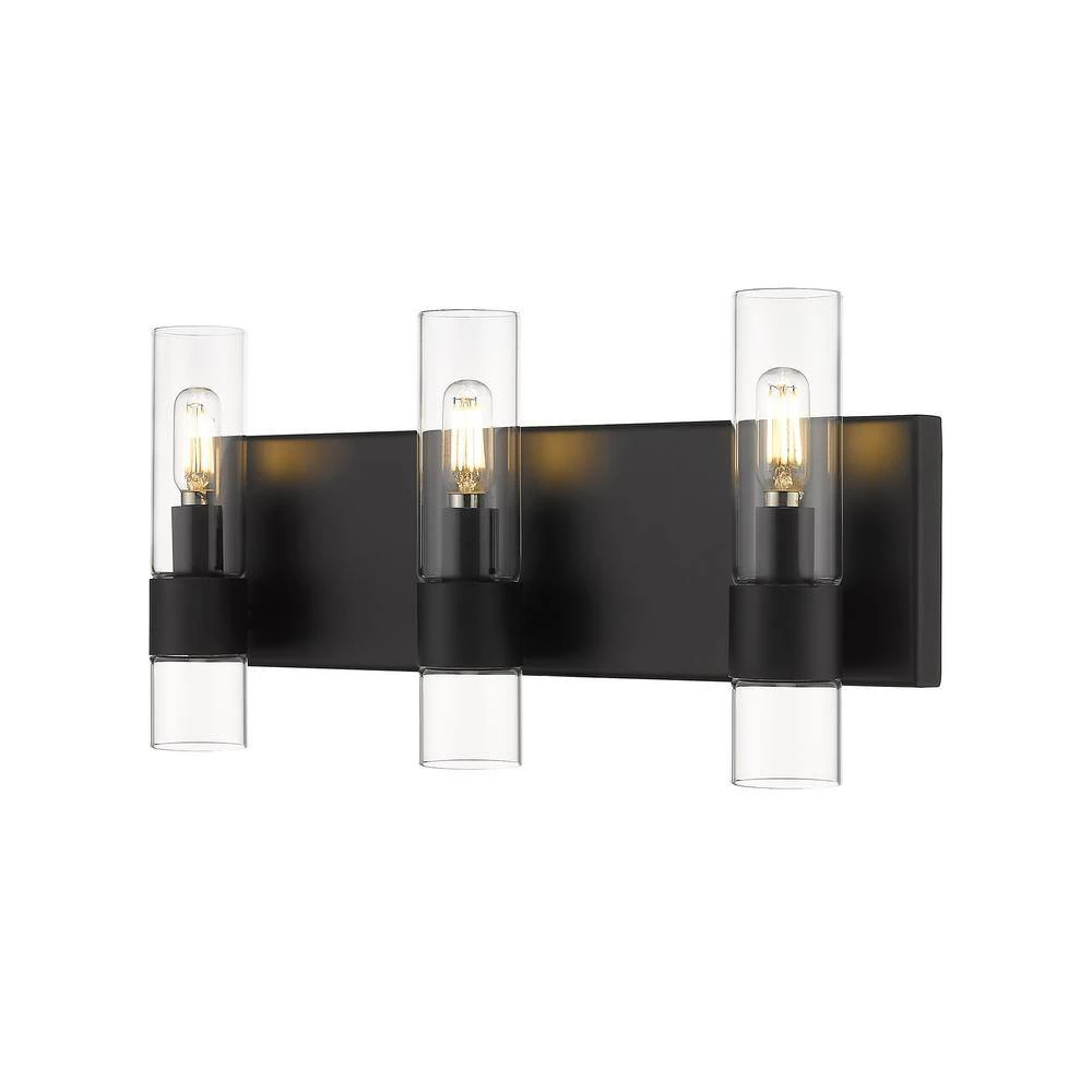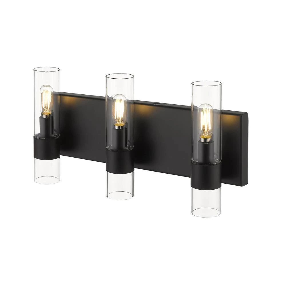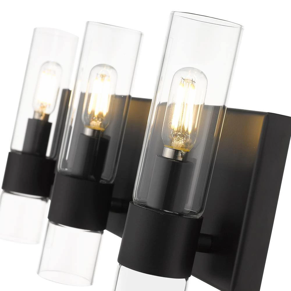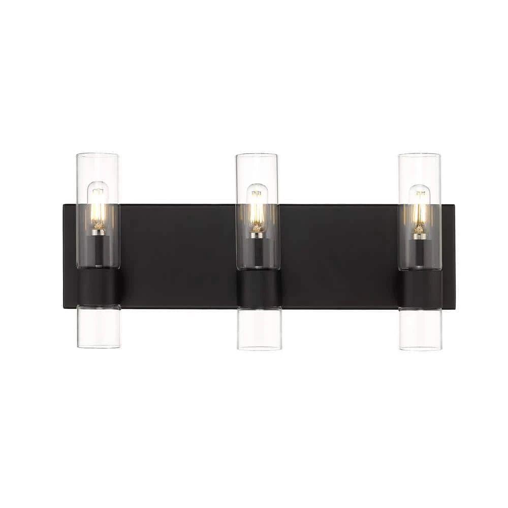 Explore the sophisticated silhouettes of the Bruce contemporary lighting collection by OVE Decors. With its matte black finish, modern clear glass cylinder shades, candelabra inspired sconce arms and generous 18 in. W span, the Bruce III 3-light vanity bar sconce delivers an airy, on-trend look in your bathroom with minimalist restraint. 3 warm white dimmable ENERGY STAR certified LED bulbs with vintage influenced exposed filaments complete this stylish transitional fixture. Also available in a brushed nickel finish, with solutions for every room including single or multi-light bathroom vanity sconces, dining room chandeliers and kitchen pendants.