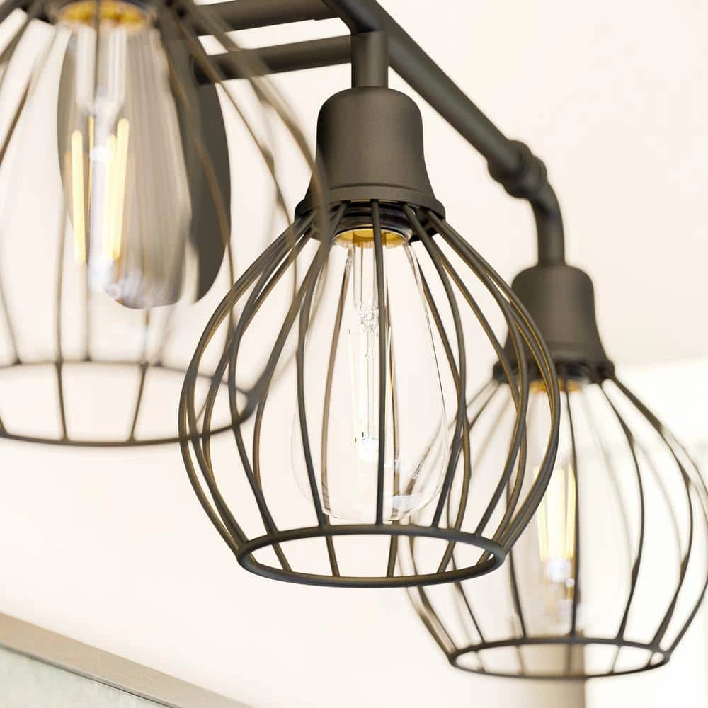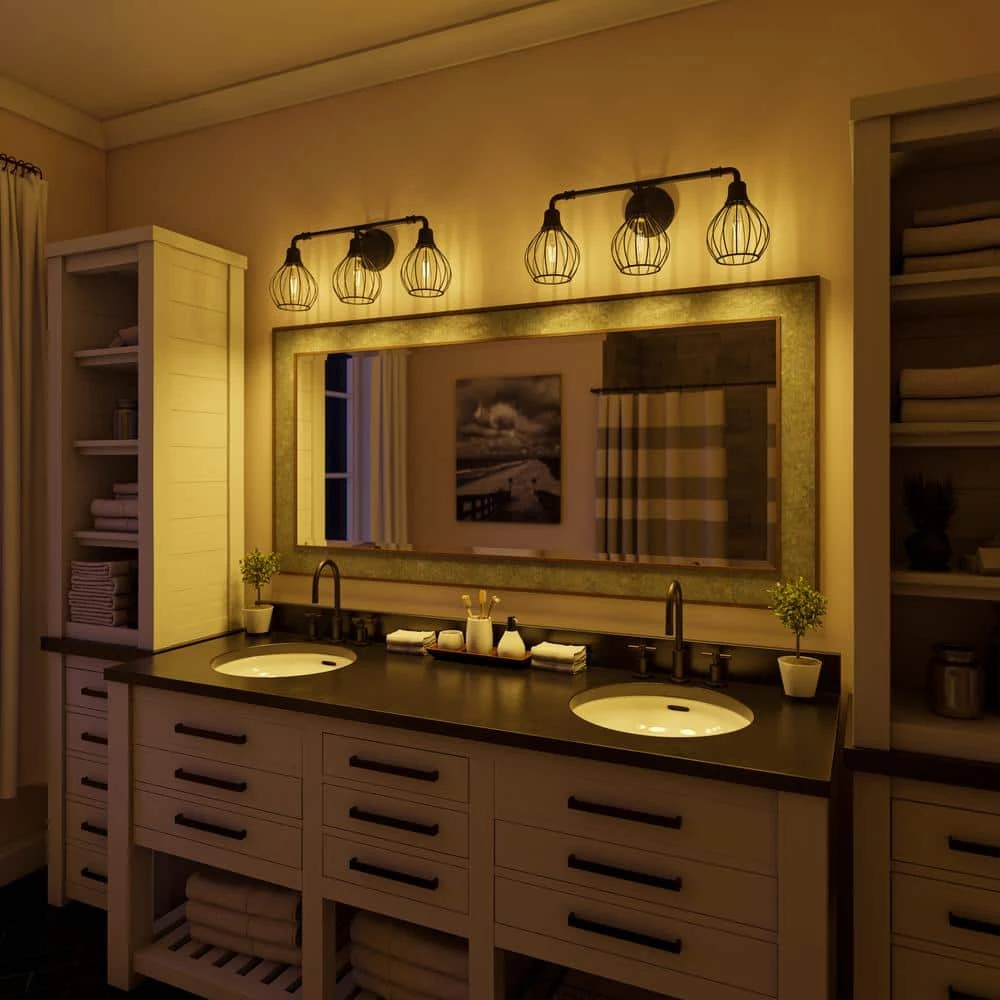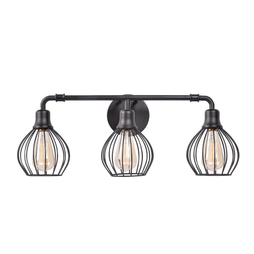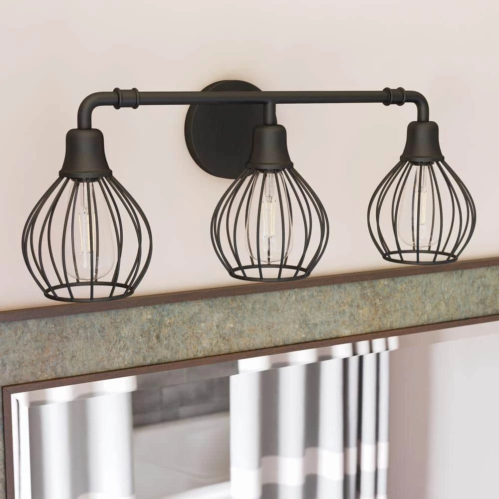 This edgy urban contemporary 3 light vanity fixture is sure to bring plenty of bright lighting and effortless modern style to your industrial master bathroom. Matte black finished wire frame shades give a modern industrial feel, while the open shades allow your choice of bulb to freely shine – perfect for use with vintage-style Edison bulbs or other designer bulbs.