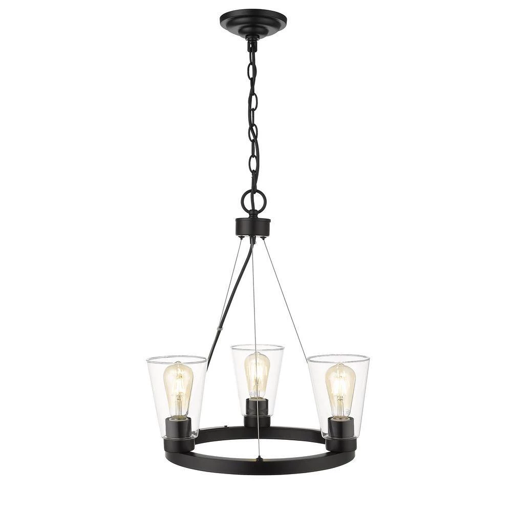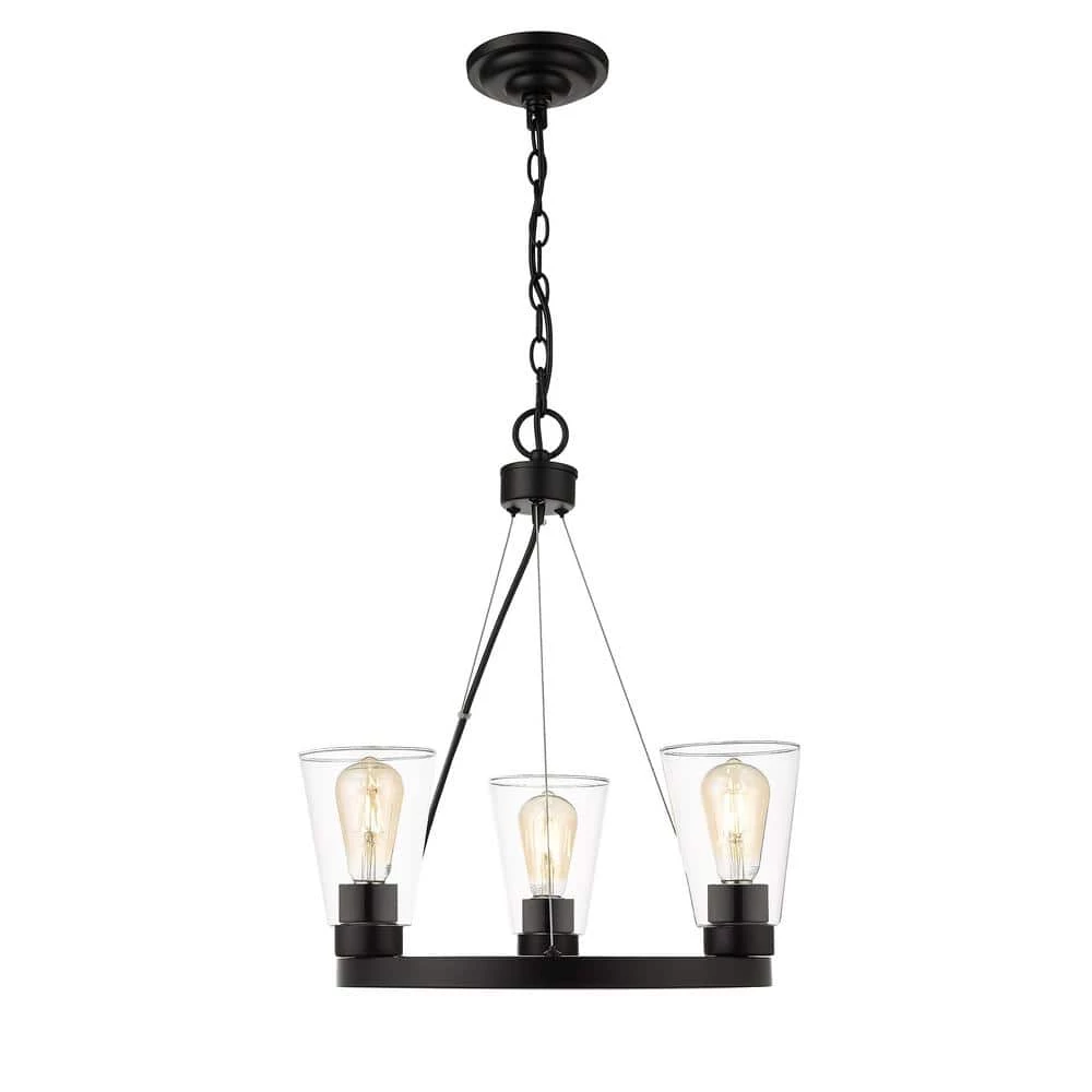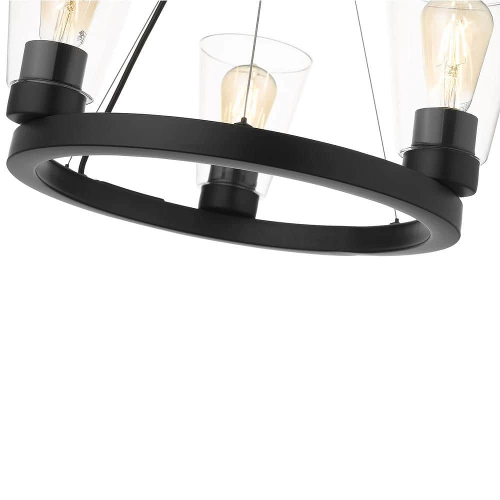 Polished minimalism shines in the Clark V 3-light ring chandelier by OVE Decors. With its modern clear glass conical upright shades and black finished fittings, the Clark adds a simple and serene touch to any room. 3 vintage inspired warm white exposed filament ENERGY STAR certified LED bulbs are fully dimmable for perfect mood lighting.
