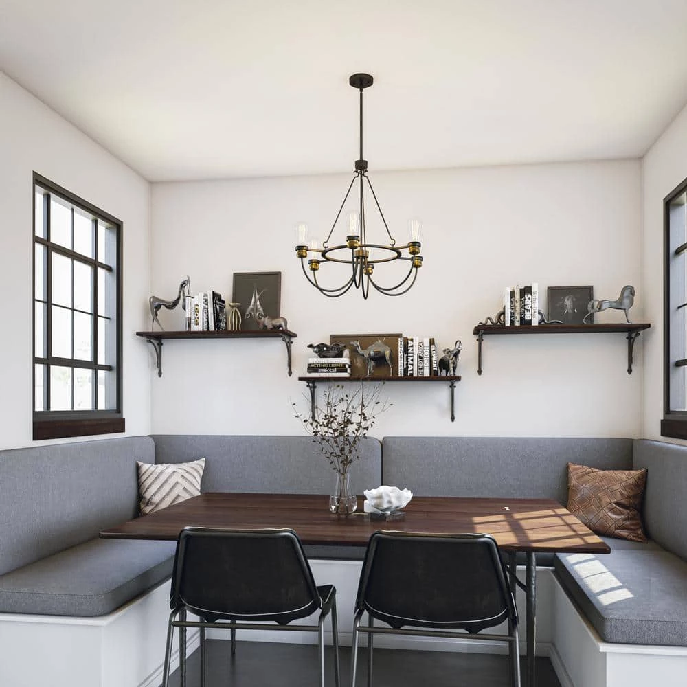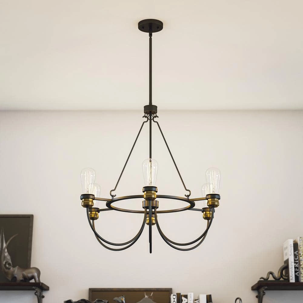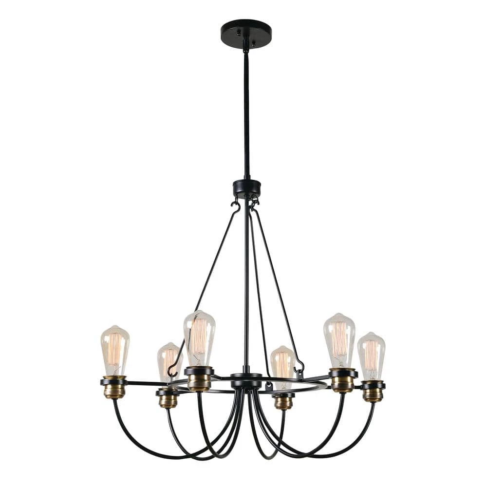 Industrial overtones merge with a classic open frame shape to create this airy, gothic-inspired 6 Light Chandelier. Supported by three elongated hooks, the six arms of the chandelier appear to delicately float beneath the chandelier while the upper canopy merges into a set of matched finish down rods that extend into the ceiling offering a unique dual suspension effect. Each bulb socket features a gorgeously detailed plated antique brass ring, providing a warm and striking counter balance to the lustrous black finish of the chandelier body. Included with this chandelier are six (6) LED vintage Edison bulbs, giving you immediate energy efficient throwback style right out of the box.