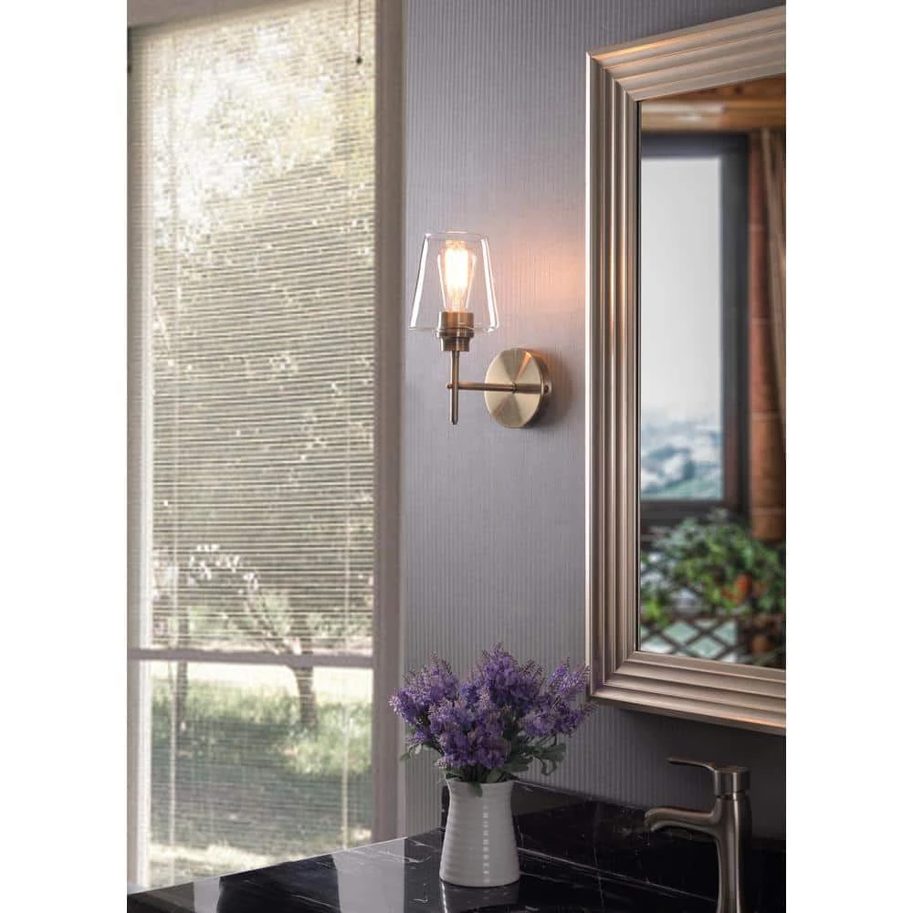 Take all the glamour and shine from Mid-Century Modern design and create your own Madmen inspired retreat. This Mid-Century wall sconce will bring vintage urban style to every room in your home. Line hallways and stairwells to add a pop of antique brass to your dark spaces. Flank a mirror in your master bathroom and jumpstart your morning routine in the bright, room-filling light. You can even install a wall sconce above your nightstands to use as a reading light the crystal-clear glass shades will allow the light to freely flow, adding a warm cascade of atmospheric light to fill your home. Perfect for use with vintage LED Edison bulbs or other designer bulbs, this sconce is the ultimate urban industrial accent in your throwback Mid Century Modern home.