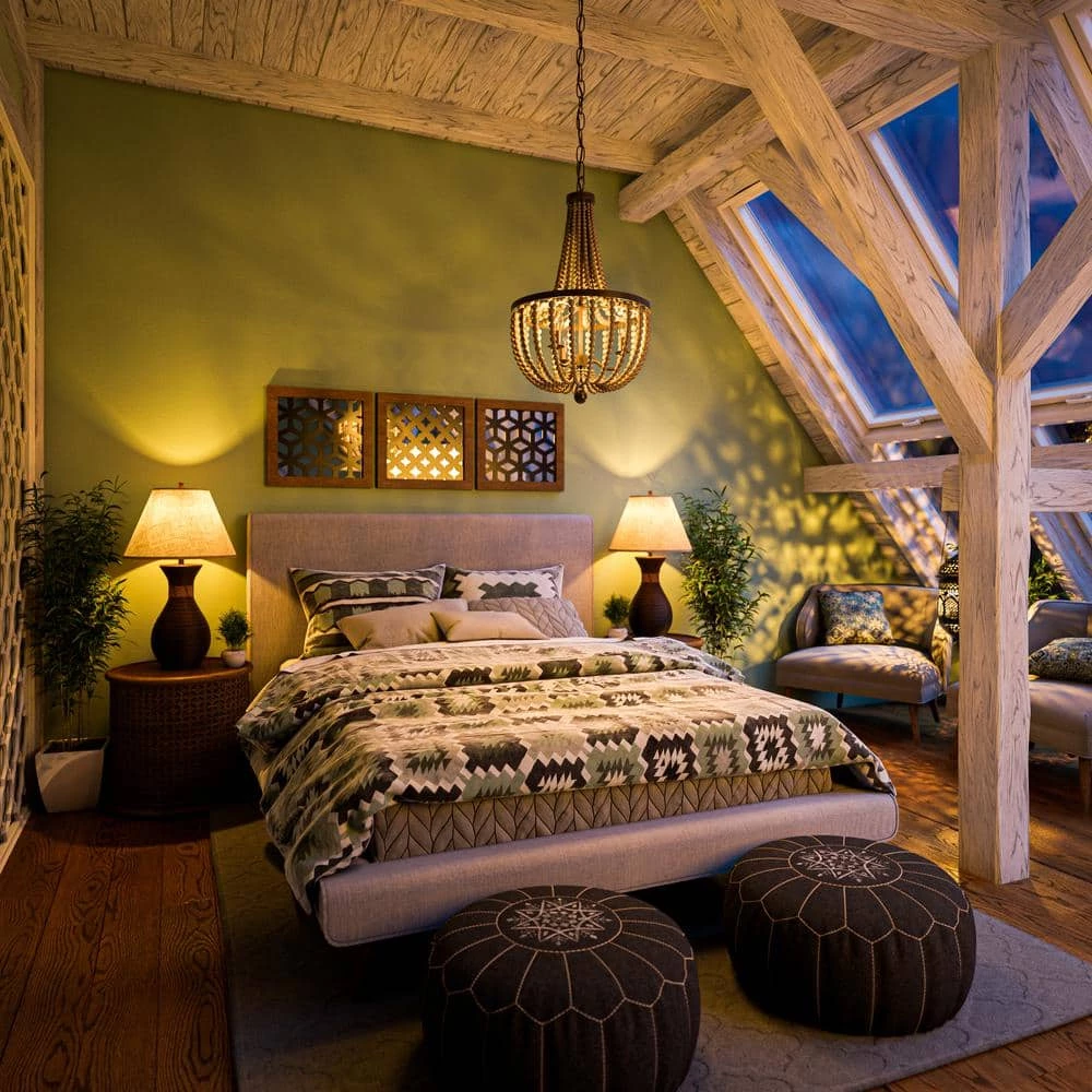 The essence of Bohemian interior design blends comfort, eclecticism, and rustic worldliness into one free flowing expression of individuality. We believe that our Dumas 3 Light Wood Bead Chandelier perfectly captures that carefree and relaxed sensibility into an elegantly crafted chandelier. While nearly all traditional chandeliers carry a ridged design composed of metal or wood, the Dumas collection defies normal convention and draws upon a bohemians favorite room divider decorative wooden beads. A series of carefully placed wooden beads harmonize together to create a lovely draping upper canopy and lower airy shade for the three candelabra bulbs. You’ll find yourself marveling at the simple, yet astoundingly rich artistry that went into the design of this boho chic masterpiece. The earthy tone of the golden bronze hardware expertly complement the tried and true color palate of the bohemian lifestyle burnt orange accents, jewel tones, and electric blues all coordinate in outstanding fashion with the Dumas 3 Light Wood Bead Chandelier. Measuring at 28 in. in height, this designer friendly chandelier is not relegated for use only in the dining room or entryway. From the free flow of wooden beads to the earthly tone of the golden bronze inner frame, this 3 light chandelier is full of life and will help shine a light on your chill and carefree design philosophy.