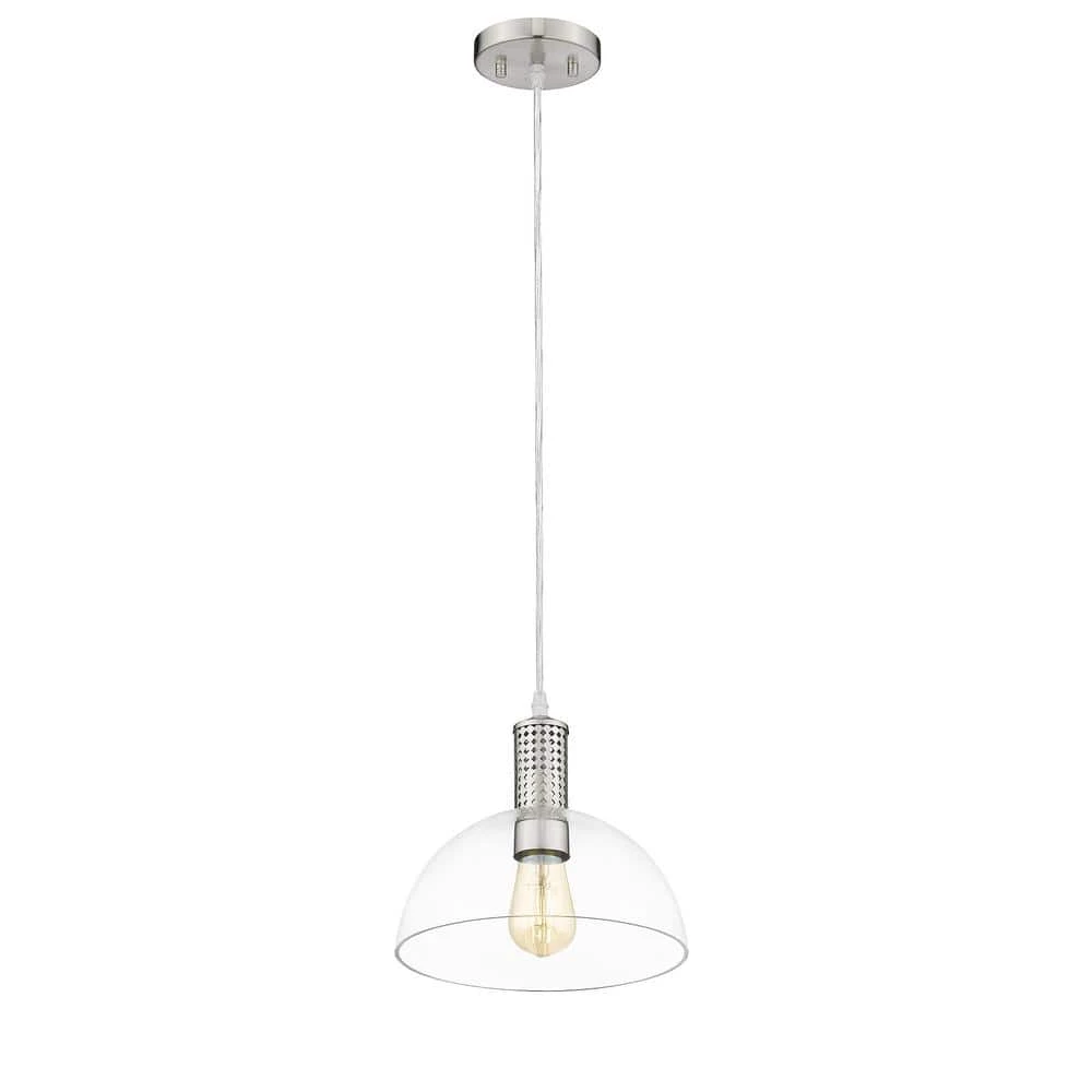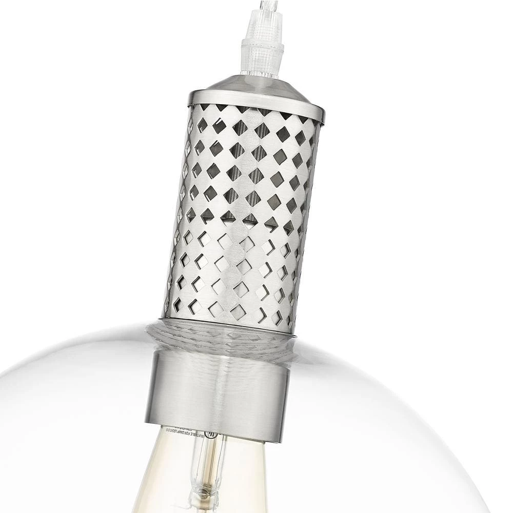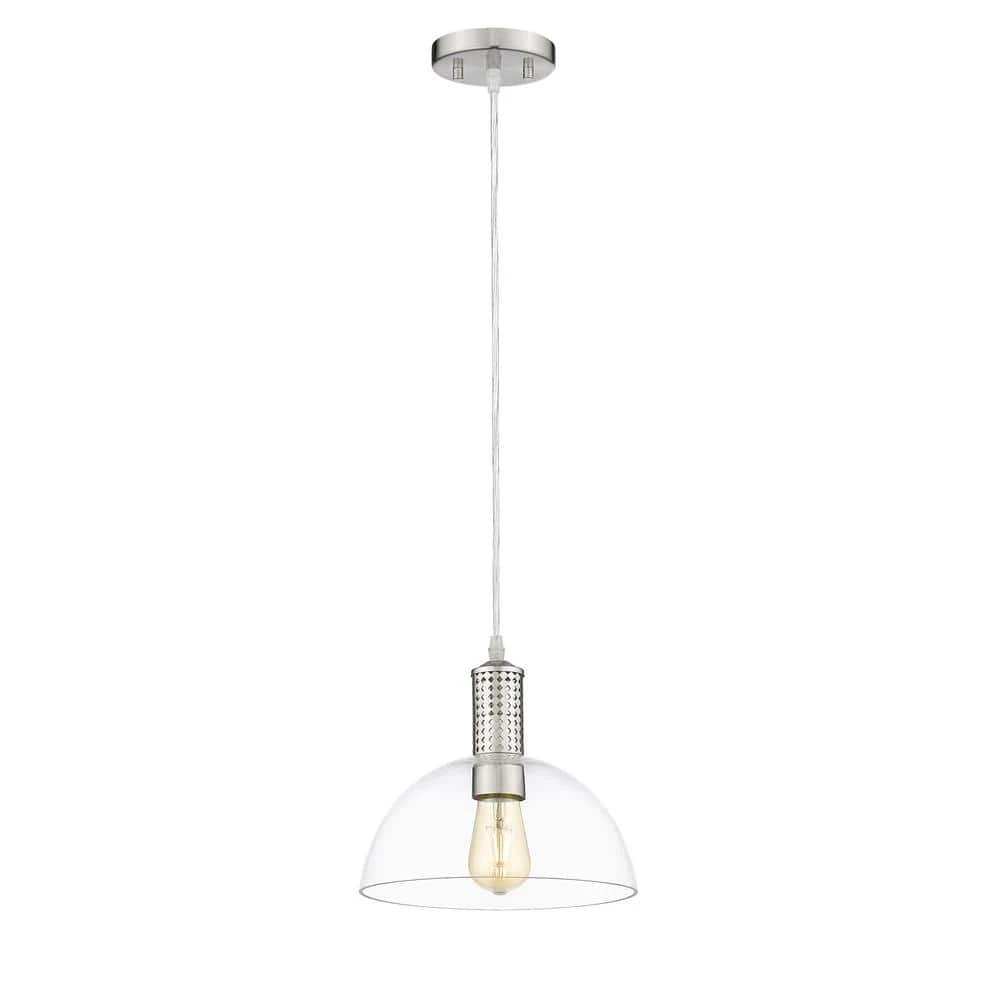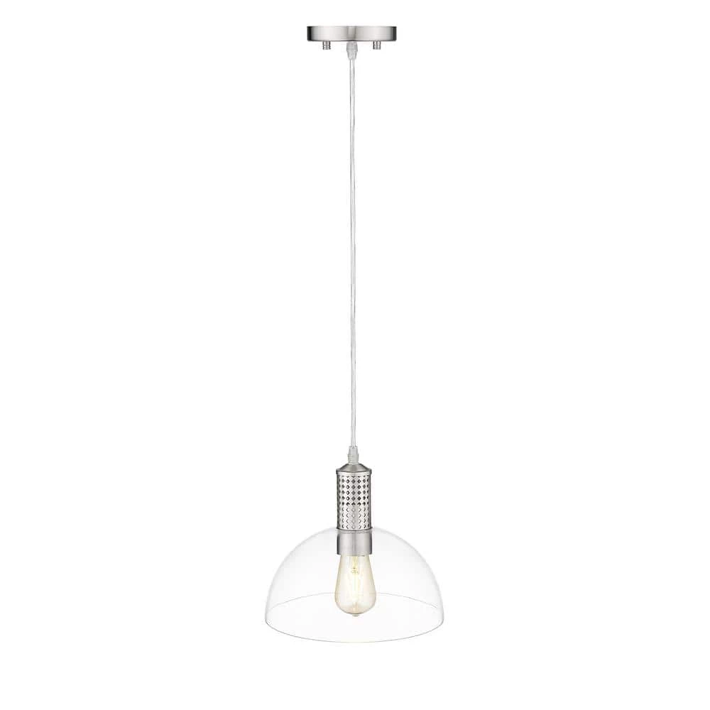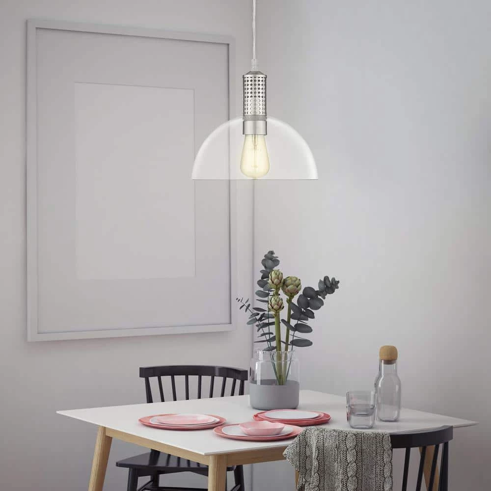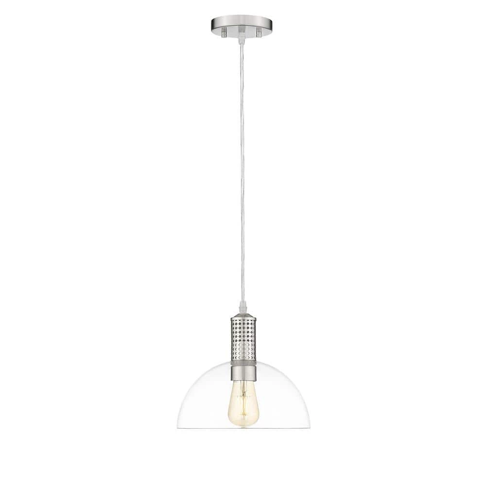 The Ella pendant ceiling light takes a traditional diner-style silhouette, and introduces it to modern design details, with brushed nickel perforated accents and a crystal-clear half-globe shade. Its exposed bulb gives it a contemporary edge, while the shade diffuses the light enough to give focus to a table or kitchen island. A smart, modern design from OVE Decors, it comes with all mounting hardware included, making it easy to set up, whether individually or in multiples.