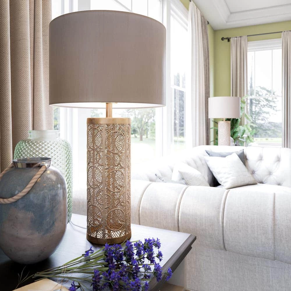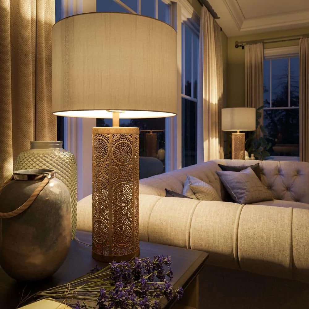 This Moroccan-inspired table lamp is absolutely stunning with its dazzling display of intricately cut patterns and lustrous golden finish. The perfectly perforated lamp body is finished in a white washed gold for a softer metallic look. The generously sized golden silk-like drum shade creates a warm, diffused light perfect for a cozy sitting room or a boho reading nook. With its luxurious, rich color palette and detailing, this lamp is the perfect finishing touch for any posh, glam or luxe living room.