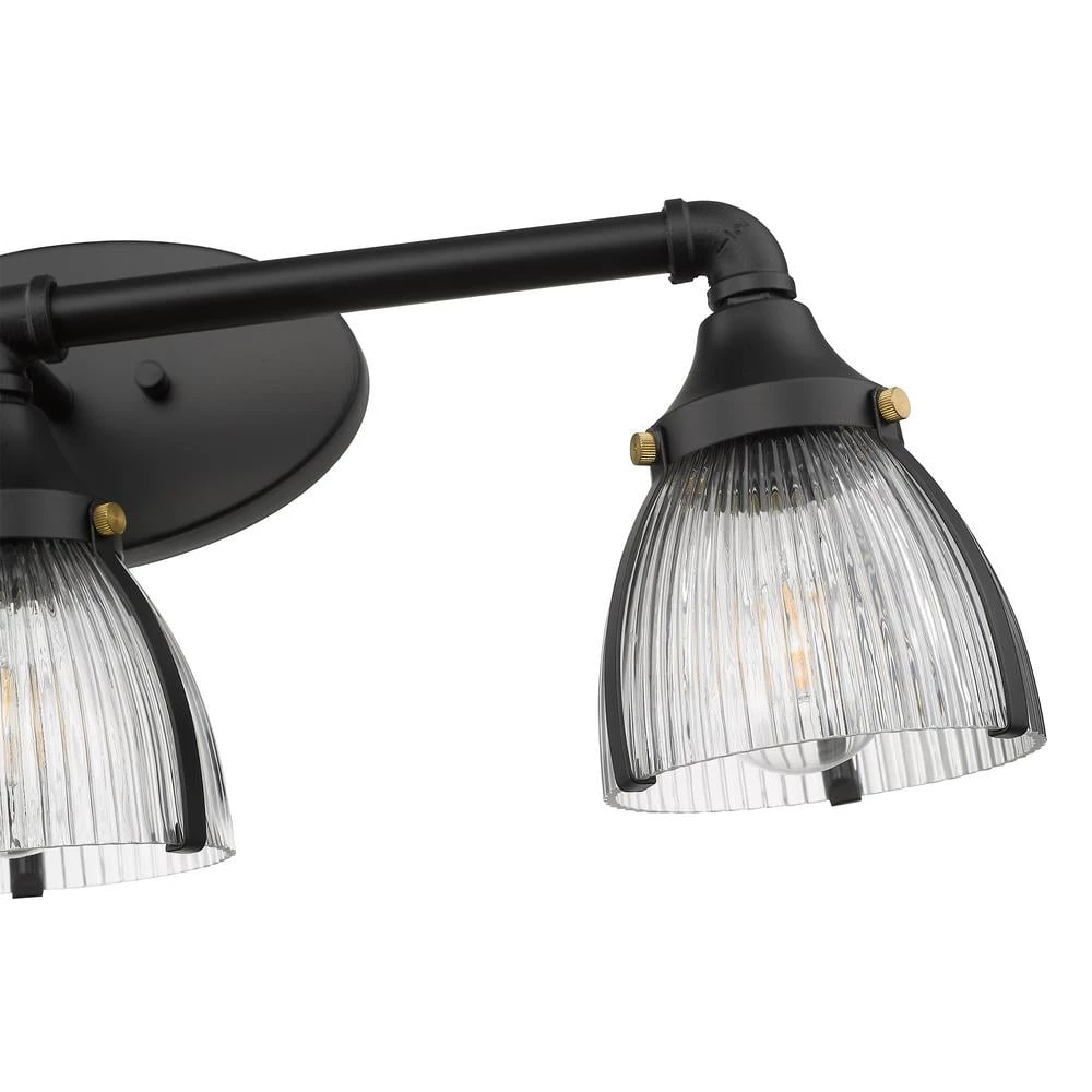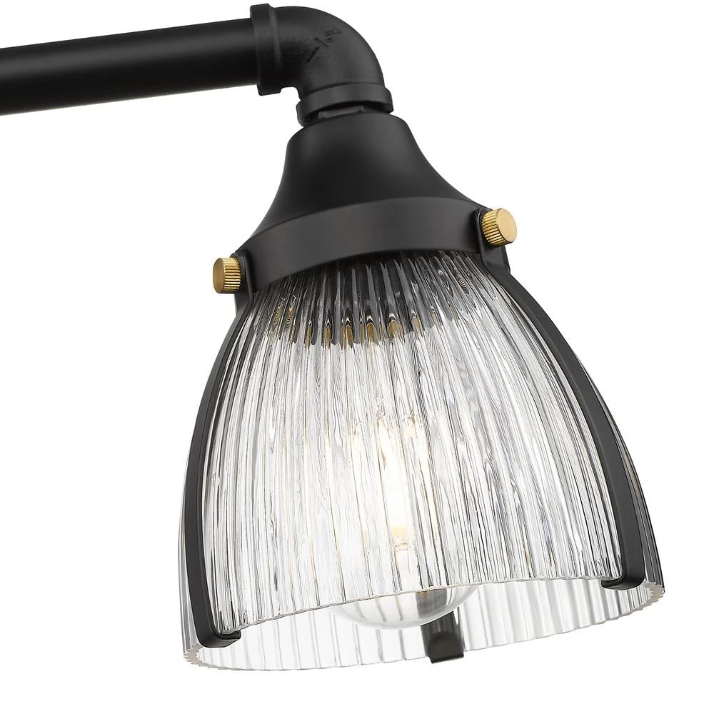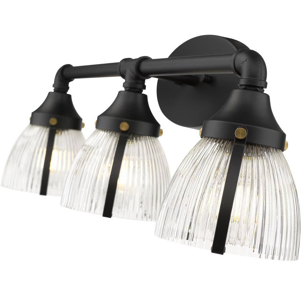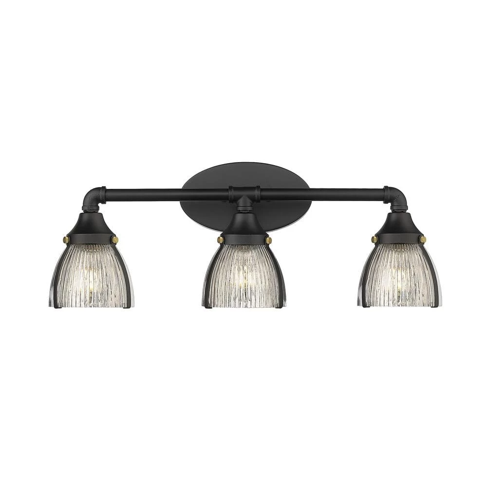 - Black iron, vanity light with 3 clear glass shades with vertical stripes and a 8.3 in. W x 4.5 in. H oval mounting plate