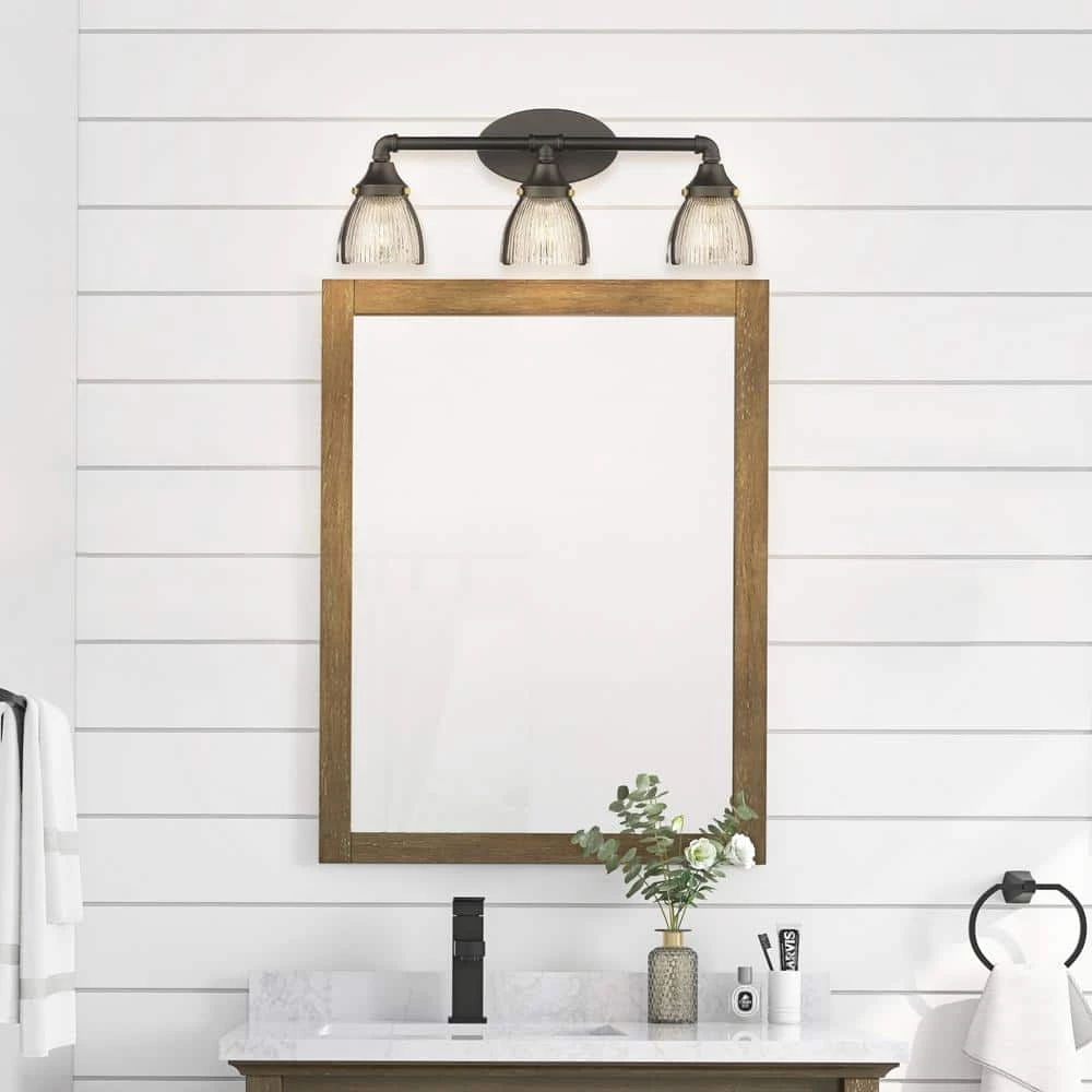 The Exeter vanity light fixture by OVE Decors is the perfect blend of contemporary design and industrial feel your bathroom needs. With its black iron frame, coupled with glass light shades with vertical stripes and a pop of color with its brushed gold bolts, is the definition of understated elegance. With its 3-light design, this fixture provides ample lighting to your bathroom vanity area. Pair it with other fixtures from the Exeter family to complete the industrial/contemporary look of your bathroom.