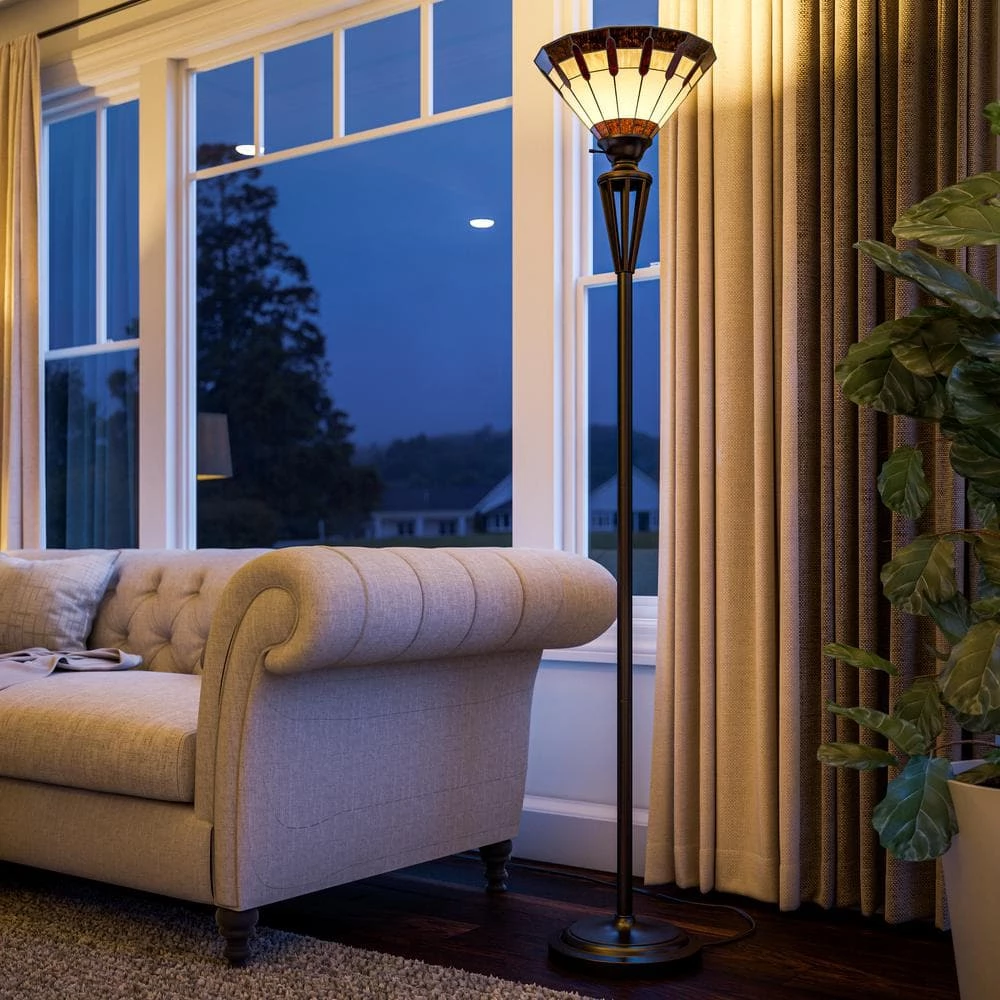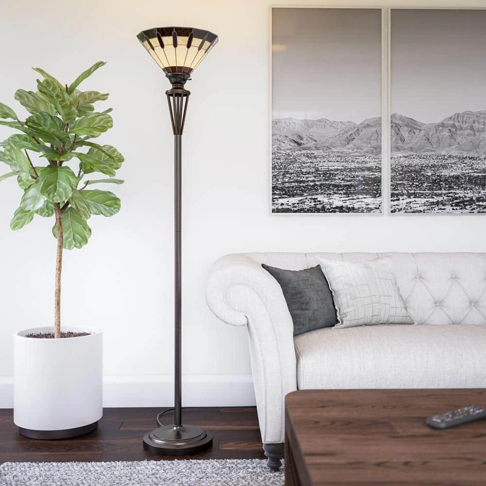 Featuring brilliant art glass shades, The Harmond Tiffany Torchiere introduces a modern twist to the classic art glass style lamp. A unique open frame construction in the base keeps the Harmond profile light and airy. This design provides a unique visual and helps draw the eye upwards to the vivid art glass shades. The Harmond 30 in. tall table lamp is completed with a stunning 16 in. Dia art glass shade and is illuminated by 2 bulbs for a consistent display of light throughout the dynamically colorful shade. Towering at 72 in. H, the Harmond torchiere is topped with a 15 in. Dia.