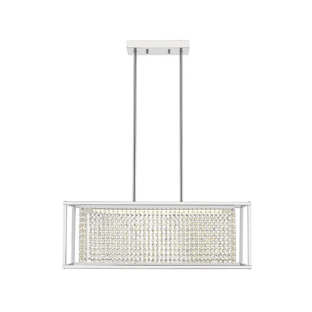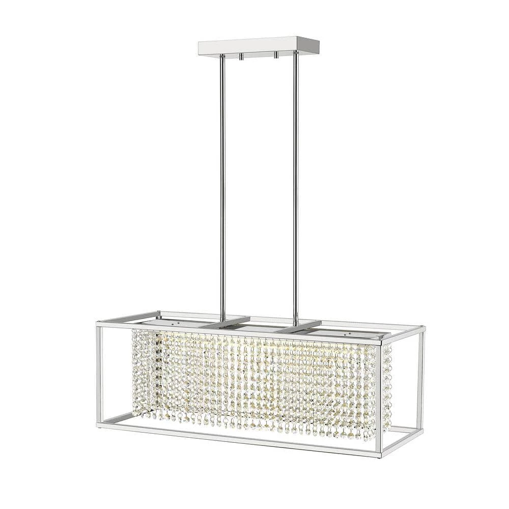 Get compliments galore with the glamorous Milo chrome + crystal statement rectangular contemporary chandelier by OVE Decors. An open cage linear framework in polished chrome with double rod hanging support and a slim bar ceiling canopy showcases the densely packed glimmering strands of delicate faceted crystal. Fully integrated LED lighting means you’ll never have to change a bulb, while enjoying its dimmable, evenly diffused warm white glow. Spectacular over a dining room table or kitchen island, or any room that needs a dose of sophisticated drama.
