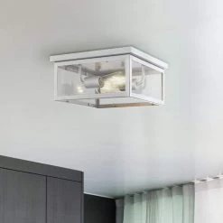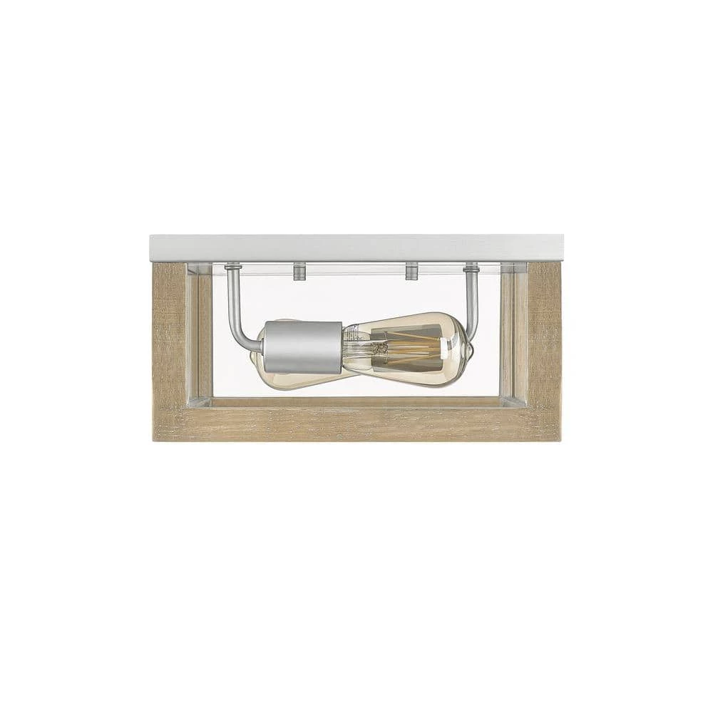 Industrial style meets chic illumination with the Lois flush mount light fixture. Its square metallic mount and angular solid pine wood cage complement each other beautifully, with a transparent glass shade diffusing the light with perfect clarity. Adding immediate appeal to any space, the mount and sockets are available in a Brushed Nickel paint finish and the fixture requires 2 ST58 LED bulbs fitted in parallel with an average life of 25,000-hours.
