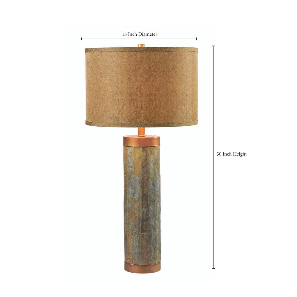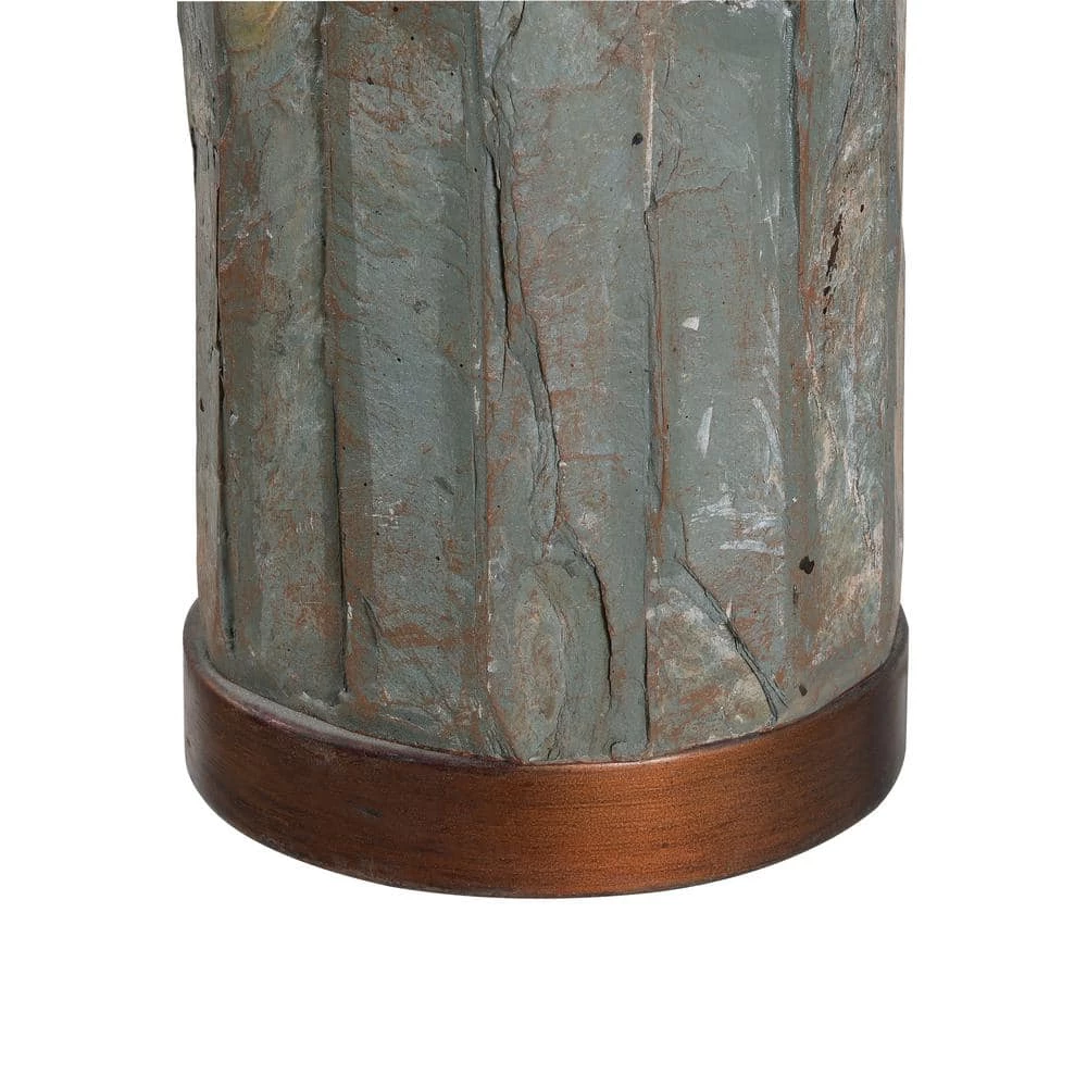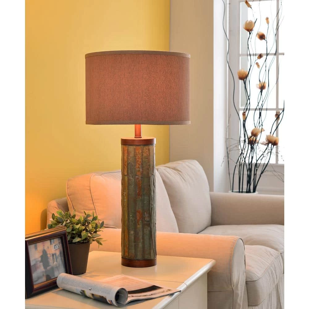 Classic design meets an organic touch – a tall column comprised of slender natural green slate tiles contrast with coppery metallic accents and an antique gold-toned modern drum shade for a look that’s timelessly elegant. With adjustable light levels and the taupe drum shade creating plenty of ambient light, the transitional Mattias Table Lamp is perfectly suited as a reading light beside your leather recliner, or as a bold accent on top of modern entry way tables, contemporary white nightstands and traditional dark wood end tables.