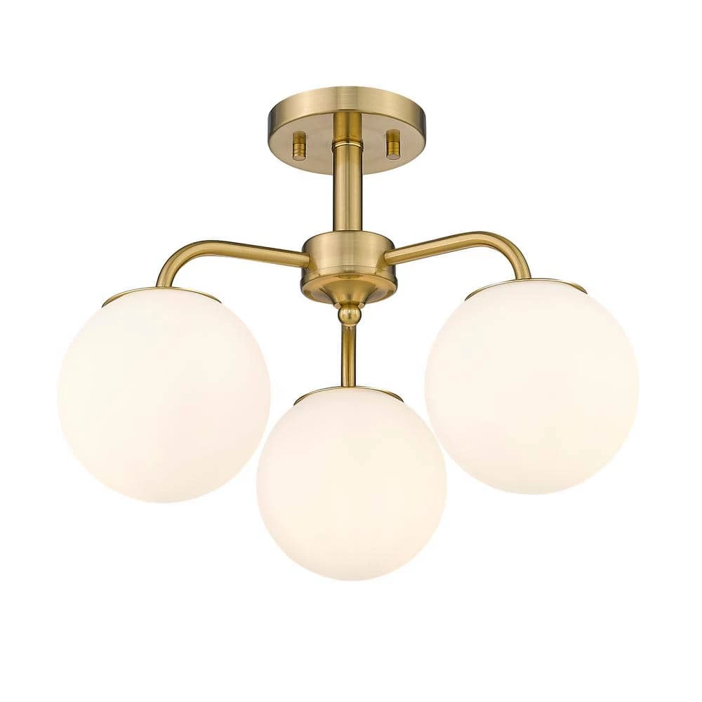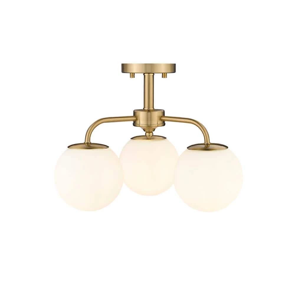 - 14.96 in. W, 3-armed semi-flush mount ceiling fixture in plated brushed gold iron with 3 frosted globe annealed glass shades, perfect for an industrial or modern designed room