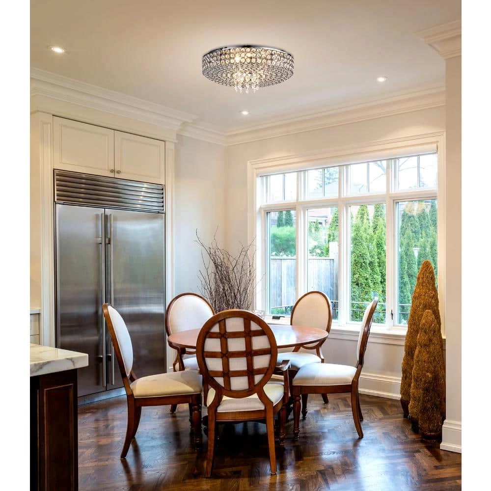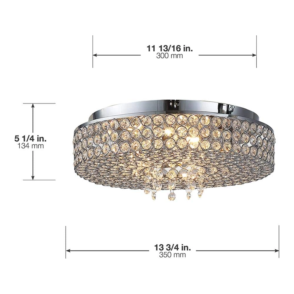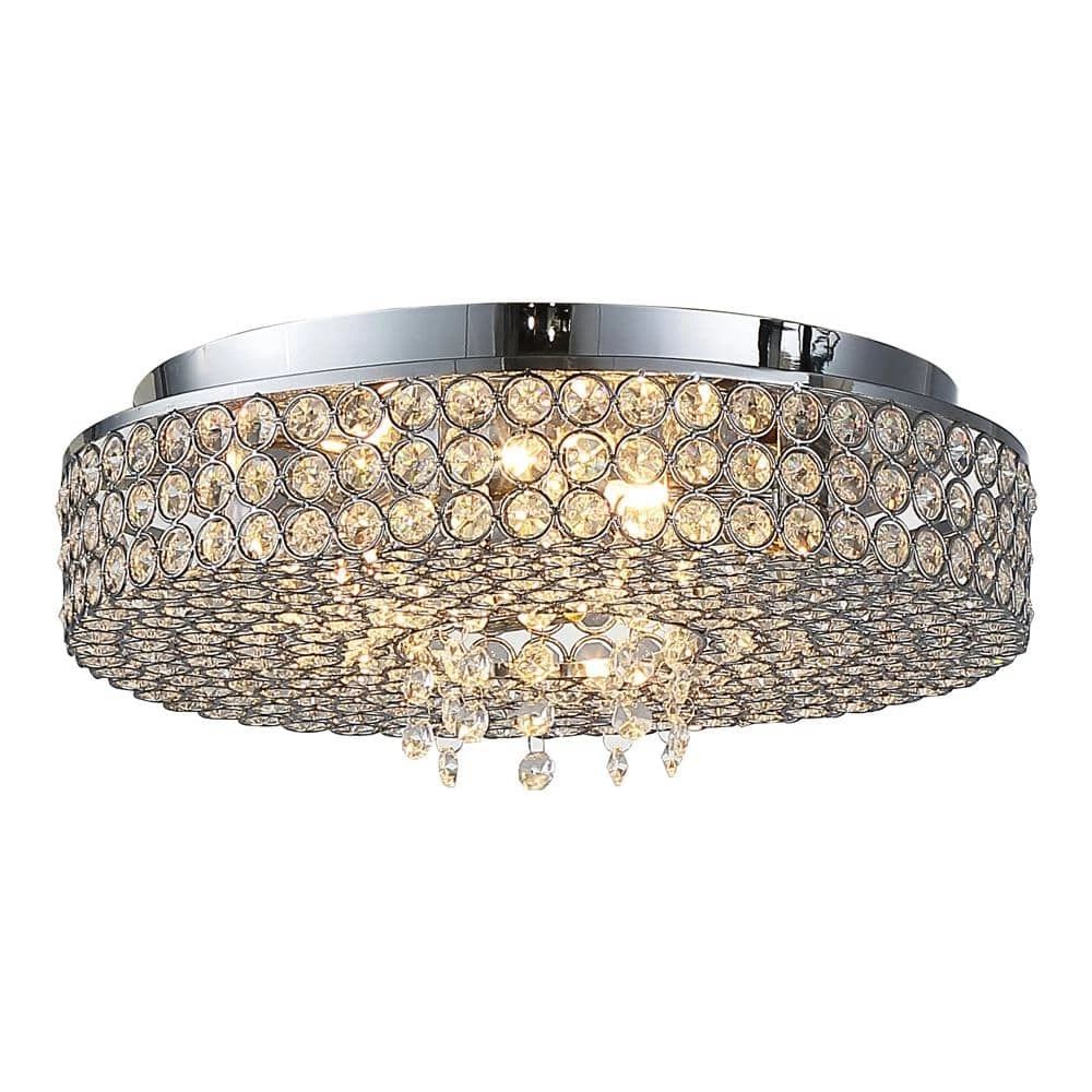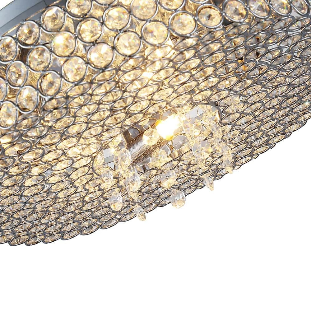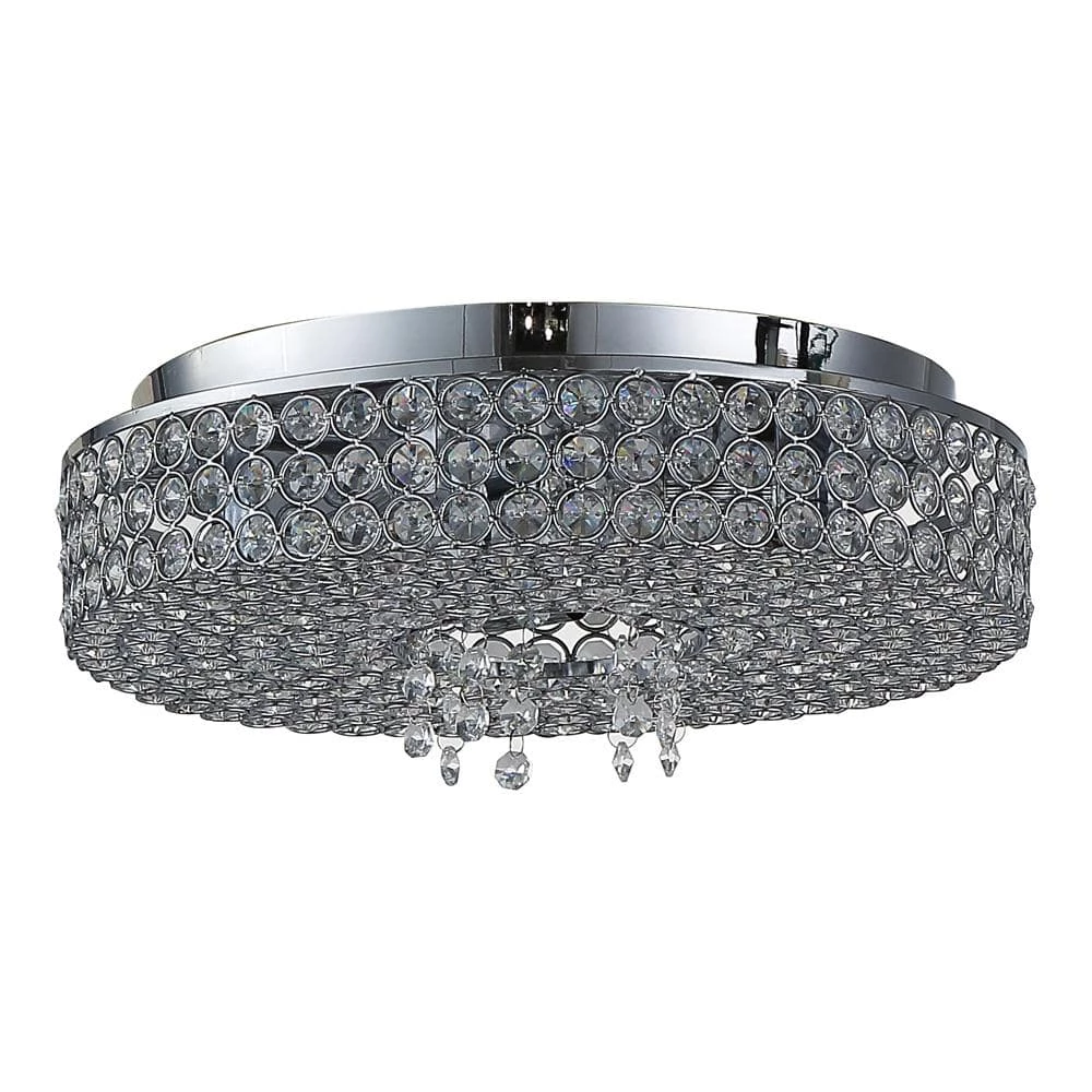 Anything but standard, the Monaco 5-Light Chrome Ceiling Flushmount from OVE Decors offers a stunning upgrade for any room. This flushmount fixture is adorned edge-to-edge with opulent inlaid crystals arranged in a circular decorative pattern and trimmed in chrome, the final result offering beautifully dramatic appeal. Light emanates warmly from the included LED bulbs concealed effortlessly behind a sleek design, ready to illuminate your surroundings.