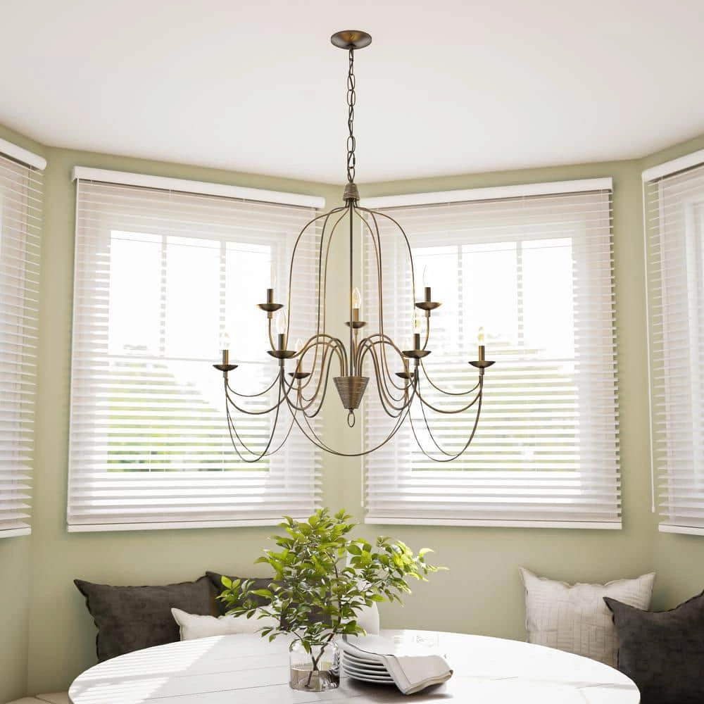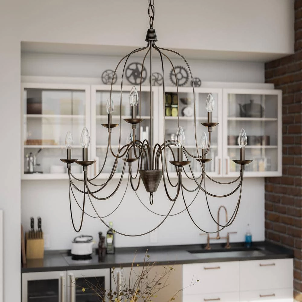 Beautifully layered curved oil rubbed bronze arms form the gothic-inspired web shape of this elegant traditional 9 light chandelier. Simple in design yet powerful in presence, this chandelier features intricately spun details around the base of each candelabra holder. This statement piece adds plenty of warm, welcoming lighting in any vaulted dining room or sloped ceiling entryway.