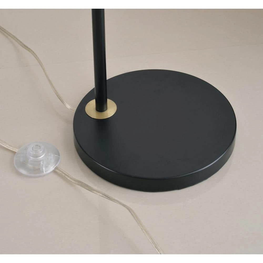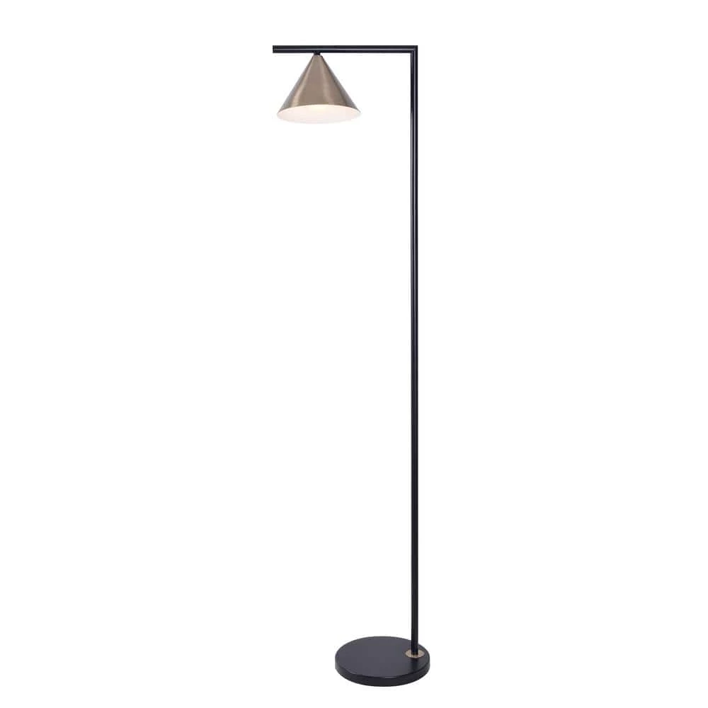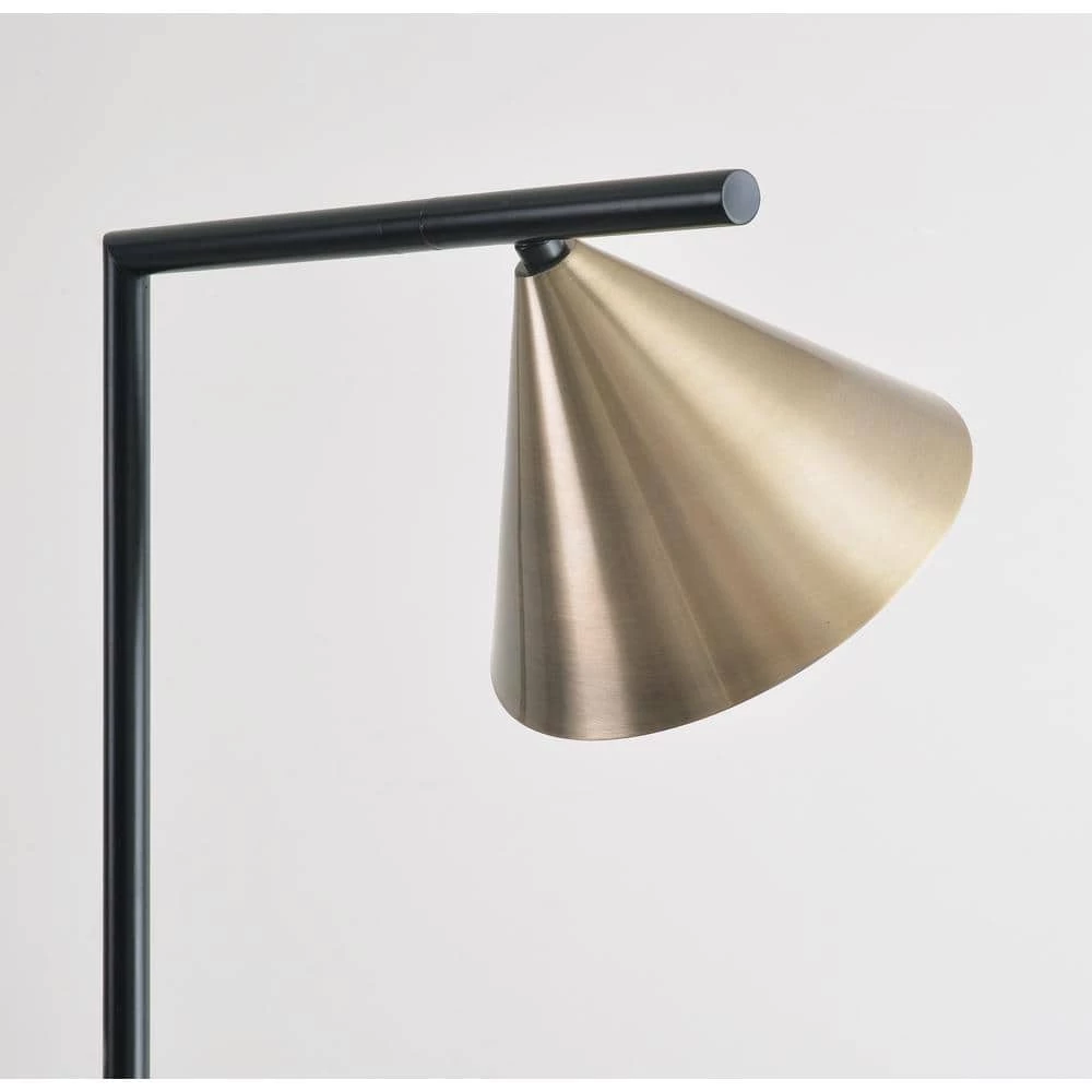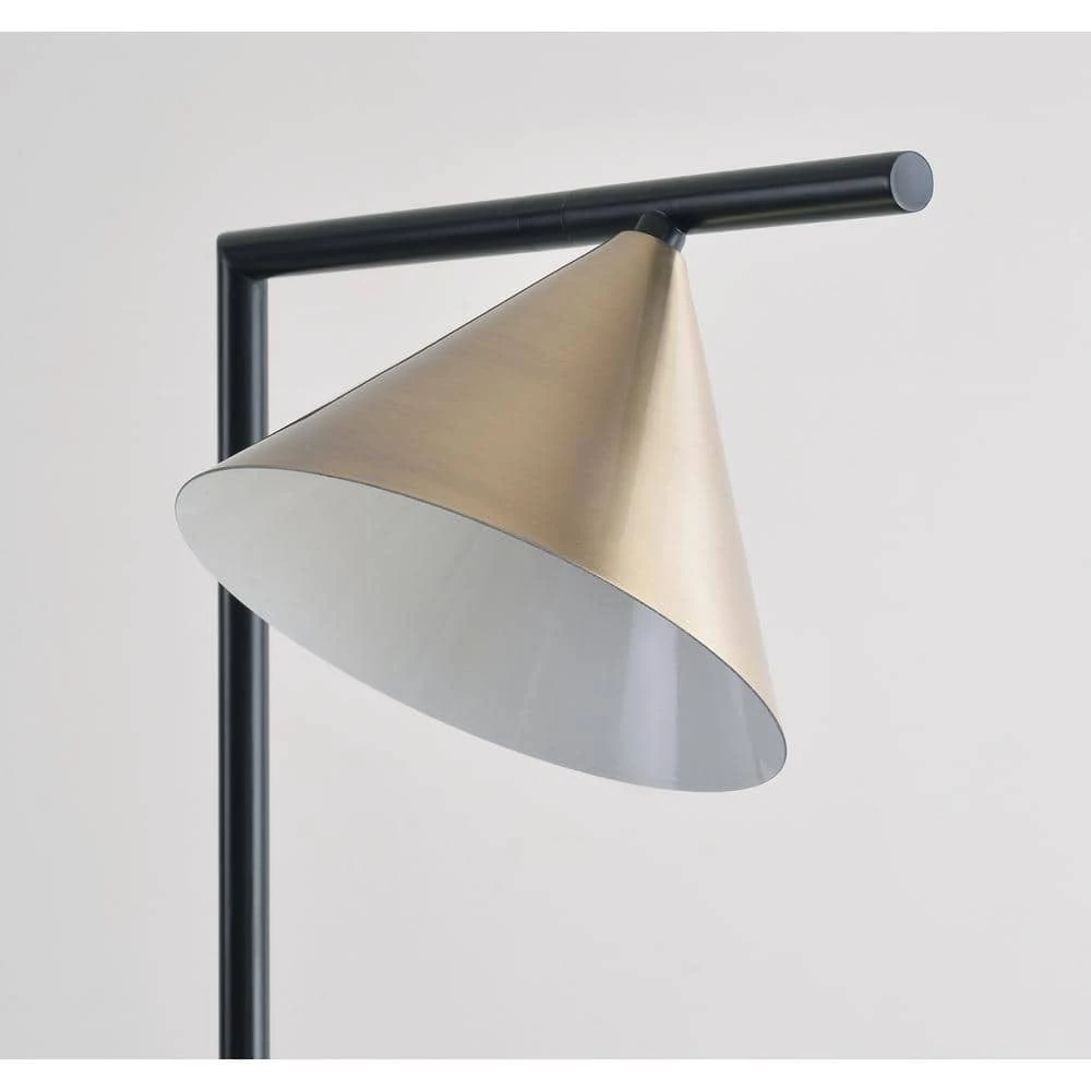 Brilliant white, lustrous metallics, and a mysterious matte black form this clean-lined modern floor lamp. A conical white-lined antique brass shade is supported by a swiveled black arm, giving bright, directional light. Perfect for placement between two accent chairs, swivel the shade back and forth to use as a shared reading light. The simple, pared down profile and bold color palette makes this floor lamp a bold, functional accent in your minimalist living space.