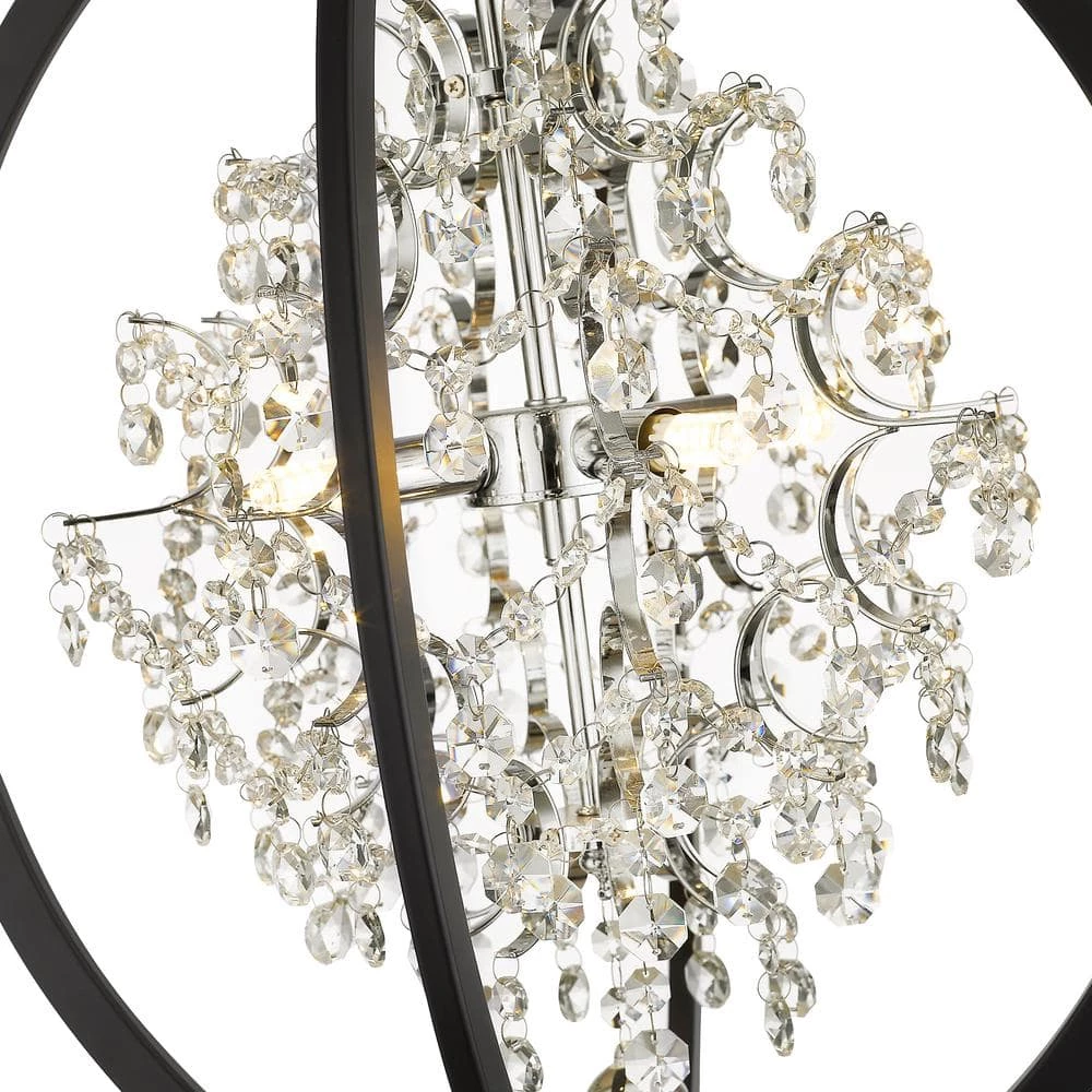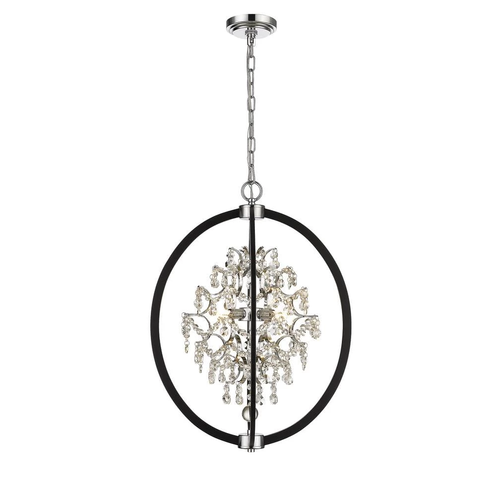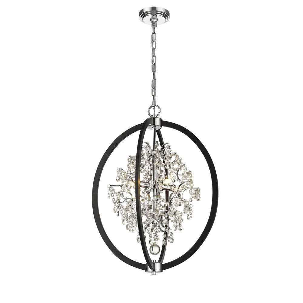 - Chandelier has a chrome finish, with the oval cage painted black, all around transparent crystals