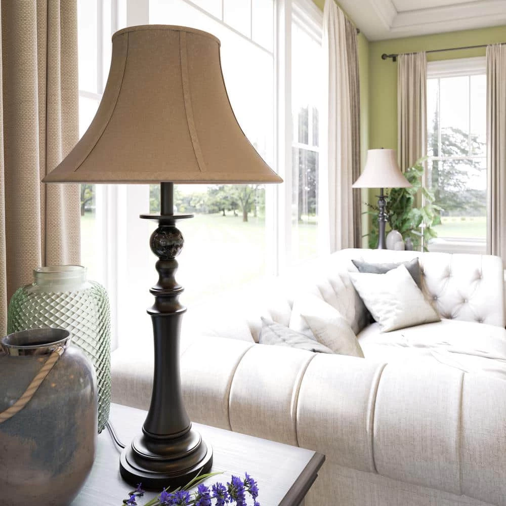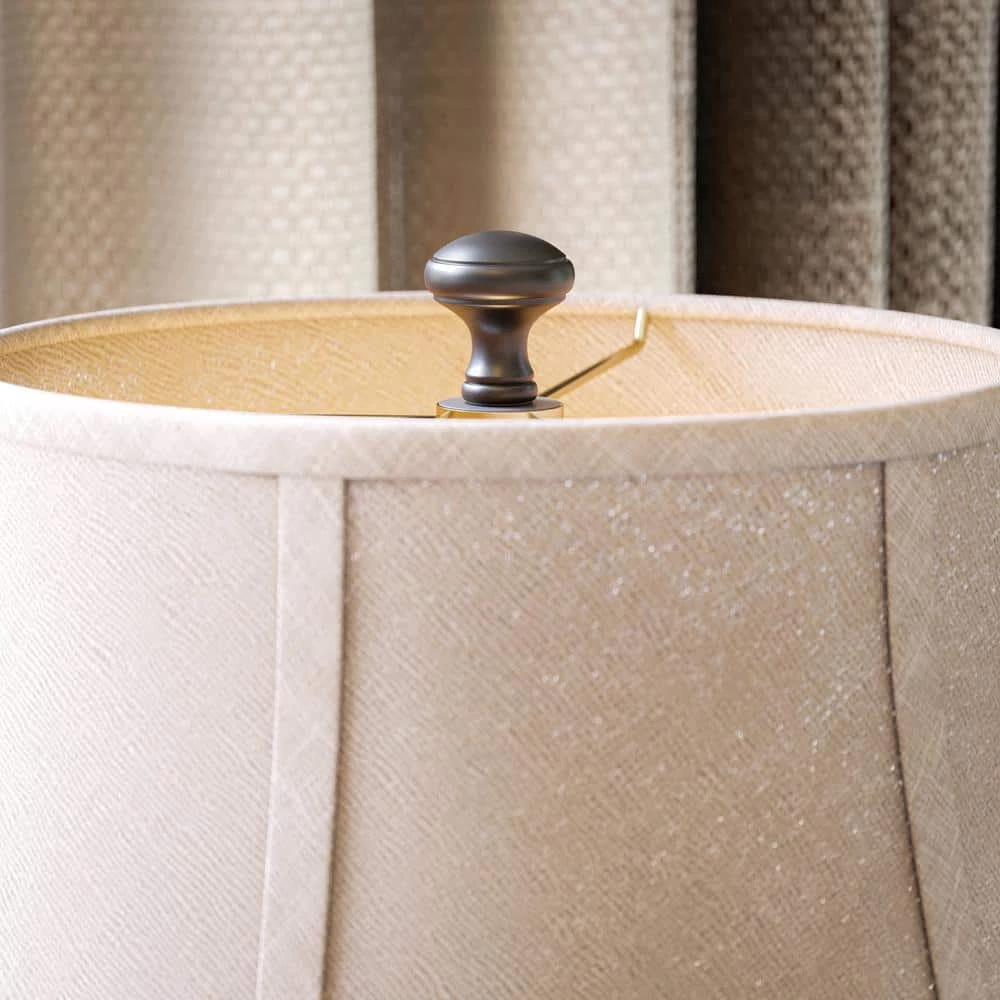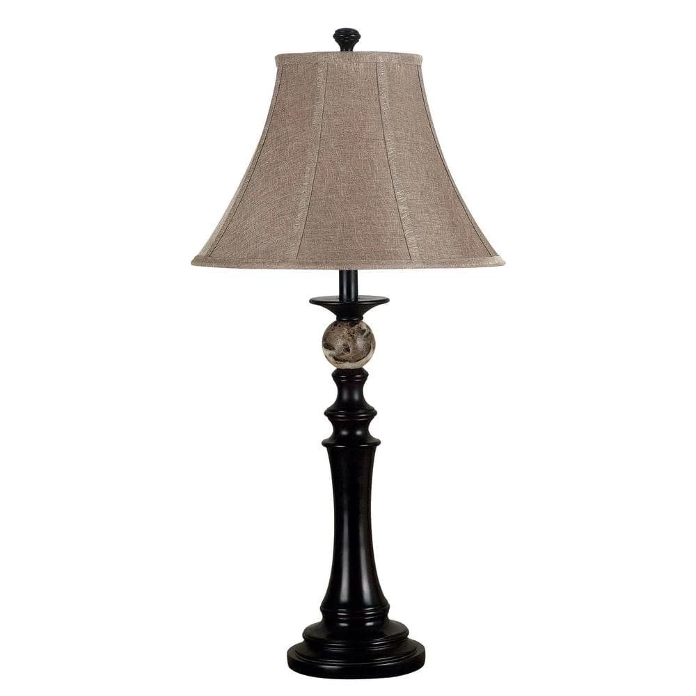 This tall table lamp features a hybrid design that incorporates style elements from both contemporary and traditional compositions. Elegantly complemented with an antique gold patterned bell shade, the table lamp will add classy flair and refinement to your home. The lamp is finished in a rich oil rubbed bronze that appears smooth and glossy under the illuminated shade. The eye-catching sculpted silhouettes are only interrupted by the alluring charm of a genuine polished marble sphere. The perfect transitional accent, this lamp will be the perfect finishing touch in your classic-contemporary home.