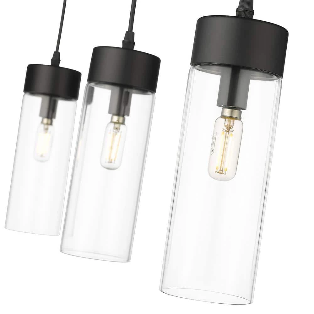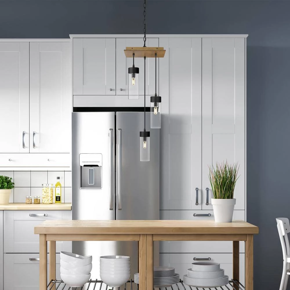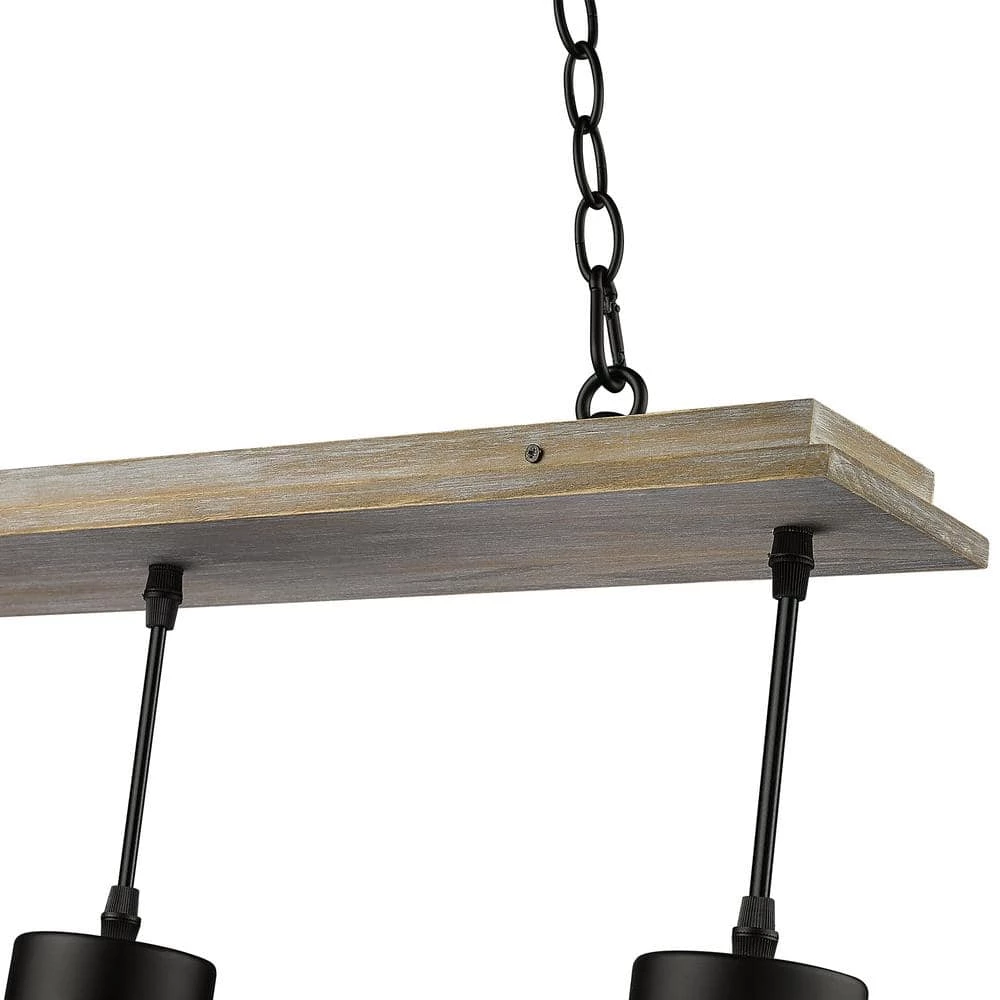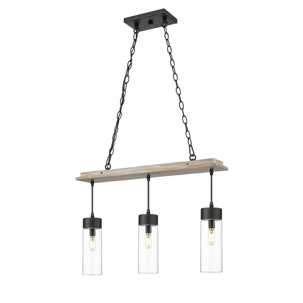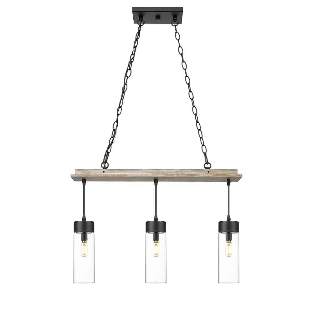 - Rectangular solid pine driftwood is held by 2 adjustable chains and mounting plate made of iron with painted black finish along with 3 annealed glass shades
