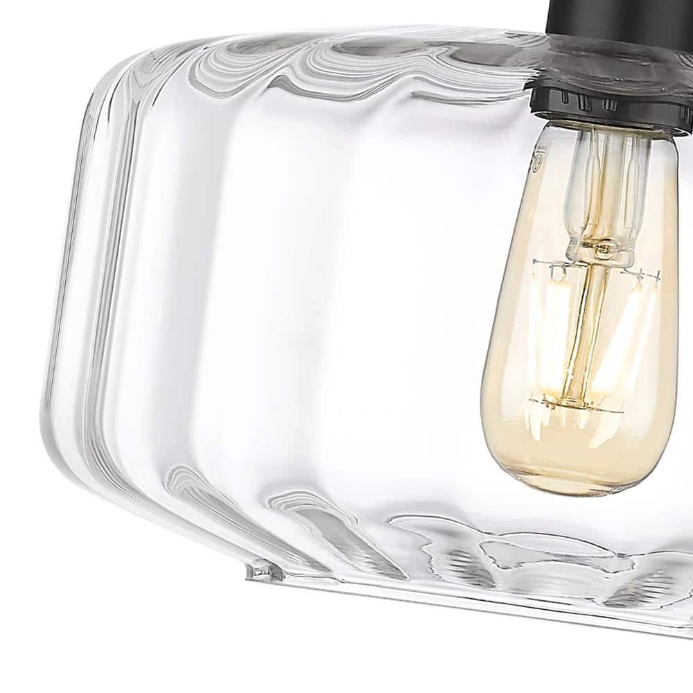 - Features a round mounting plate in black iron finish with vertical patterns on a clear glass shade