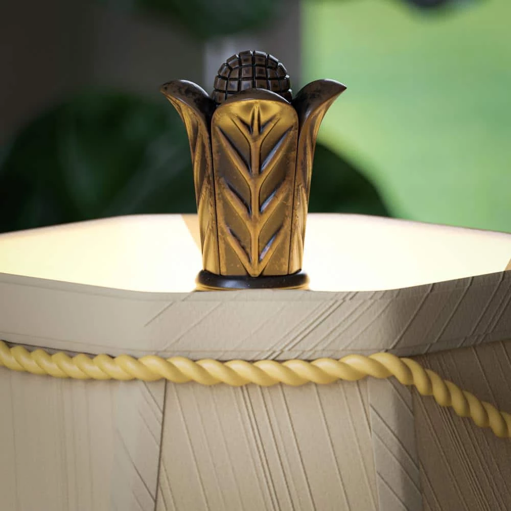 - Butterscotch cut-corner square shade with golden tassels as the perfect finishing touch