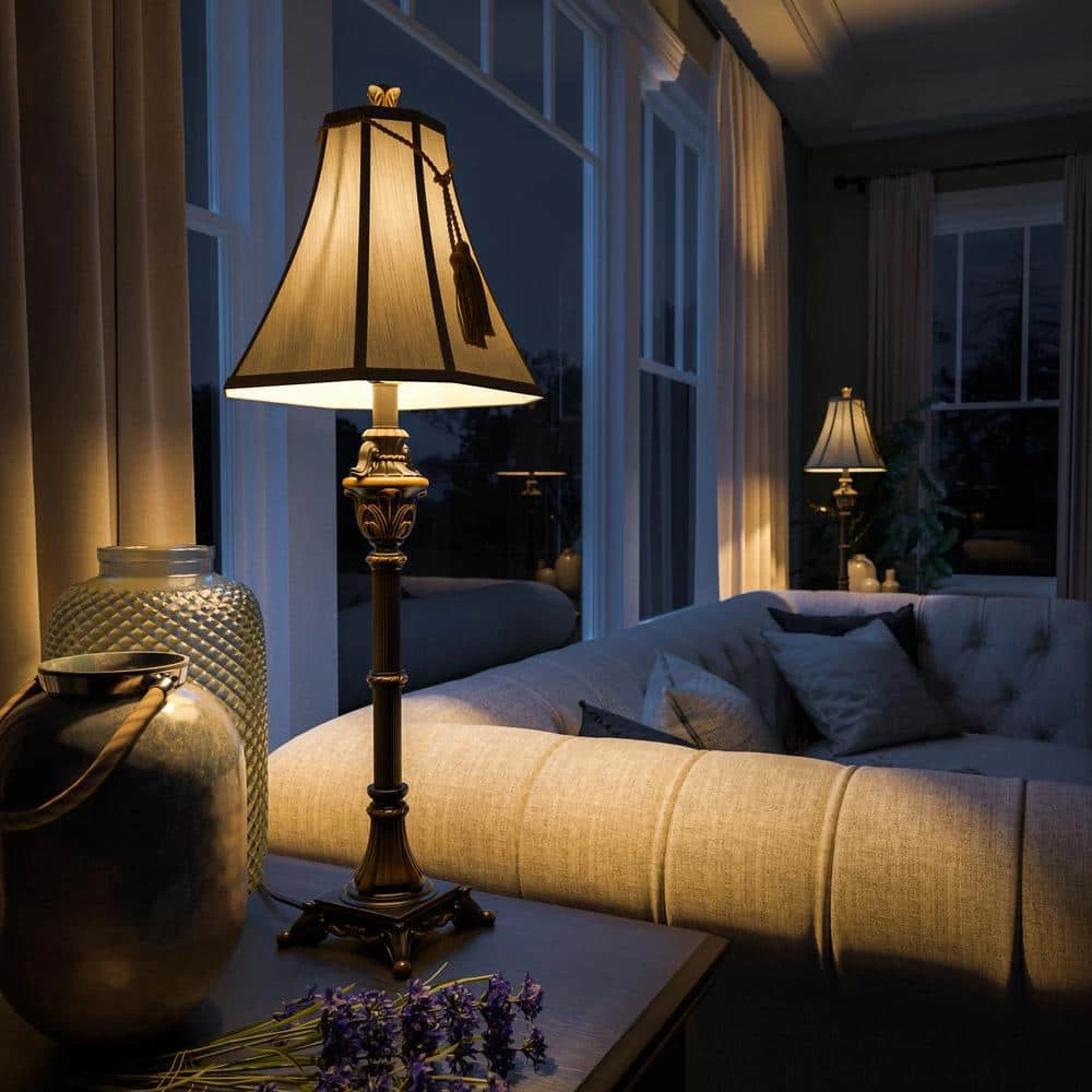 No detail was left untouched in this set of buffet lamps. A Metallic Bronze urn, covered in rich classical detail, gives Rowan the presence of an antique. The Butterscotch shade, with its unique cut corners and tassel, amplifies the elegance of this captivating family. Place one lamp on each of your rich wood end tables for a classic traditional accent in your sophisticated formal living room.