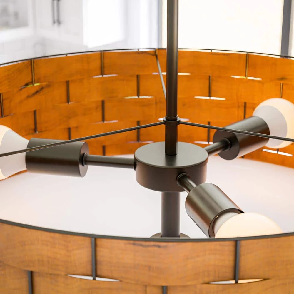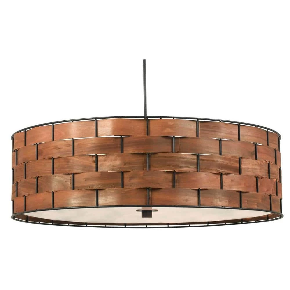 Exquisitely crafted, this pendant features dark woven wood interlaced between a bronze finished frame to create this handsome natural modern fixture. A large 24-inch diameter pendant expertly suited for illuminating pleasant dining room conversations with family and friends will add a wood grain glow to any space. This versatile and stylish pendant allows for easy infusing of natural and classy coastal style into any living area, vaulted entryway, or mixed material dining room.