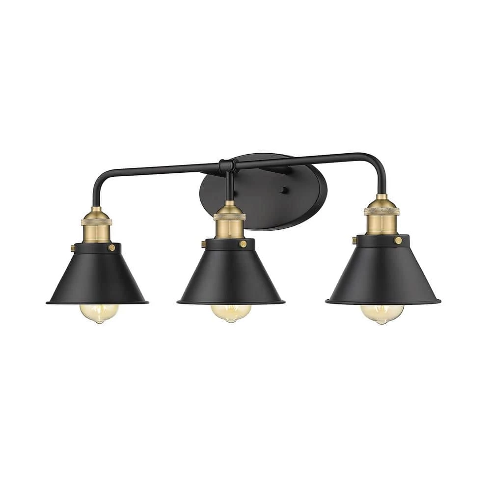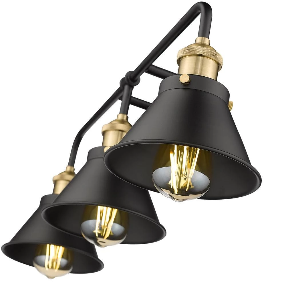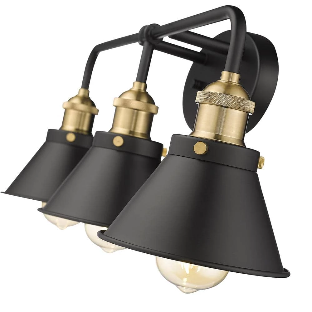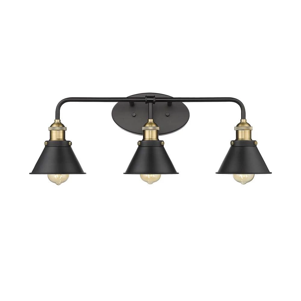 - 3-light vanity light fixture with painted black iron finish and matching cone-shaped shades