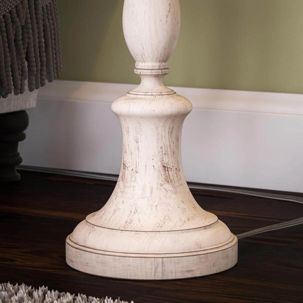 Effortlessly casual, this floor lamp adds plenty of rustic personality to your ever-changing home. The body of the lamp features stylized notches from top to bottom, creating a curvy candlestick-like base. The lightly distressed weathered white finish and textured white drum shade fits perfectly with a wide variety of styles dress this lamp up or down and pair with different accessories to create a coastal, cottage chic, farmhouse, bohemian or even eclectic living space. Whether positioned alongside a well-worn couch for overhead lighting or in the corner of a charming office, this floor lamp adds a touch of casual charm to any space.