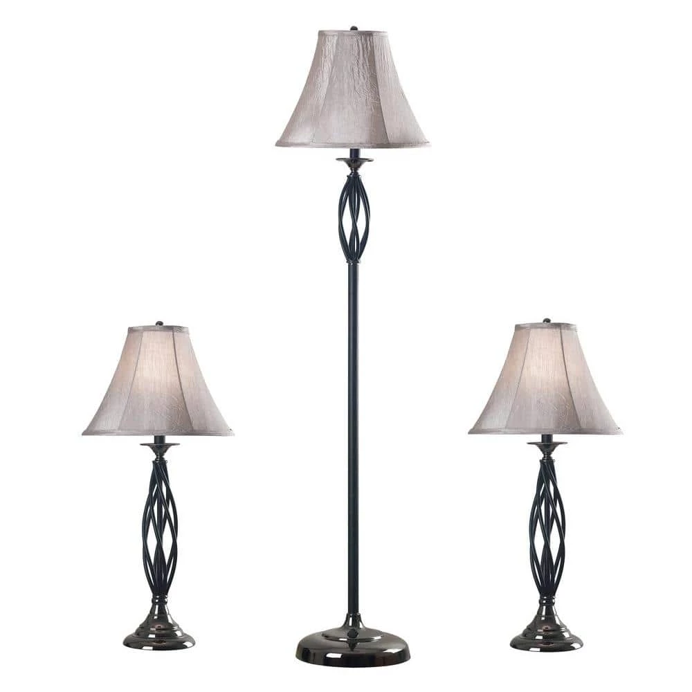 This wickedly twisted lamp set is bound to turn heads with its elegant open-work twisted column and black chrome accents. This stately collection is crowned with a silvery taupe tailored bell shade, creating a stark contrast with the black finish. This set is wonderfully suited for a wide variety of styles from traditional to contemporary. The bright light catches in the metallic fabric and the black chrome base, creating a luxurious luminous effect in your living room besides a dark leather sofa, loveseat or recliner.