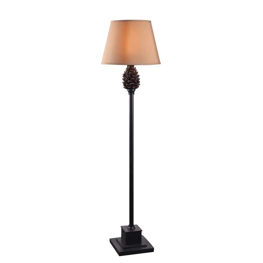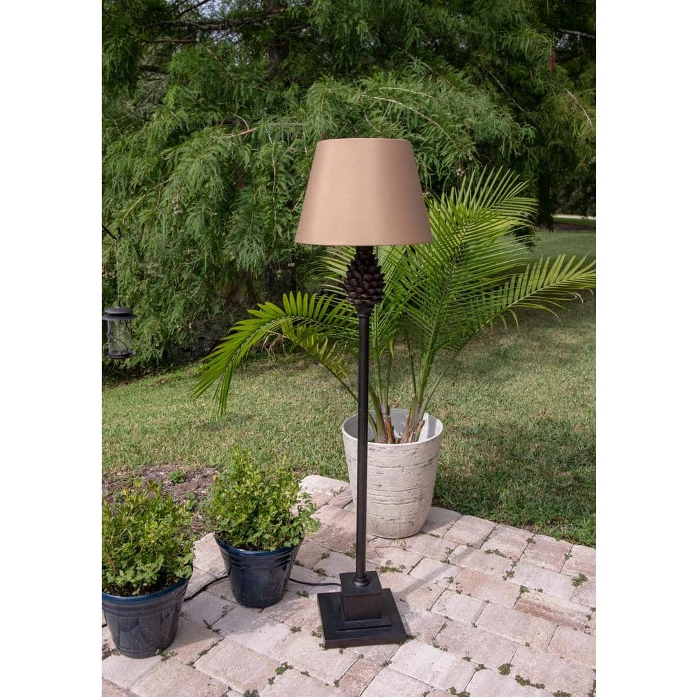 With the realistic pinecone accents and its elegant simplicity, this outdoor floor lamp helps you bridge the gap between the great outdoors and your indoor haven. This tall floor lamp features a pedestal-style base that supports a long, slender lamp body. A pinecone, finished in the same rich dark aged bronze of the lamp body, adds a textural and rustic element to the lamp that’s then crowned with a light tan all-weather shade. Weather resistant finishes and waterproof hardware protects this lamp from any moisture or inclement weather, allowing you to brightly illuminate your deck, patio, sunroom, outdoor living rooms and more even during wet, rainy evenings.