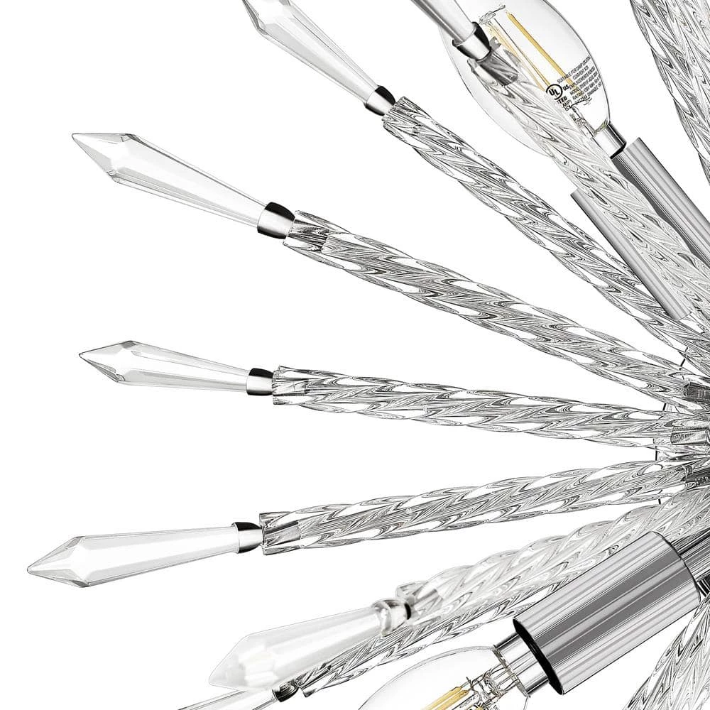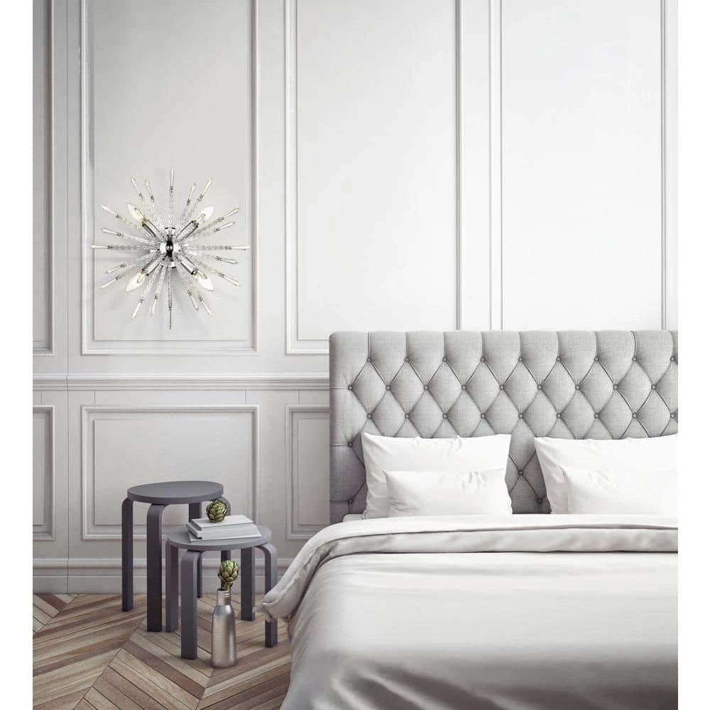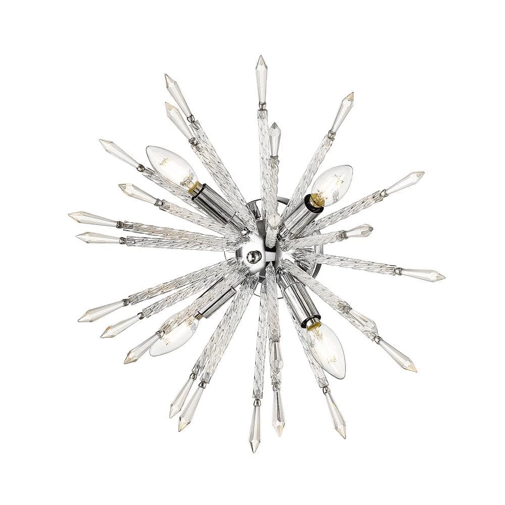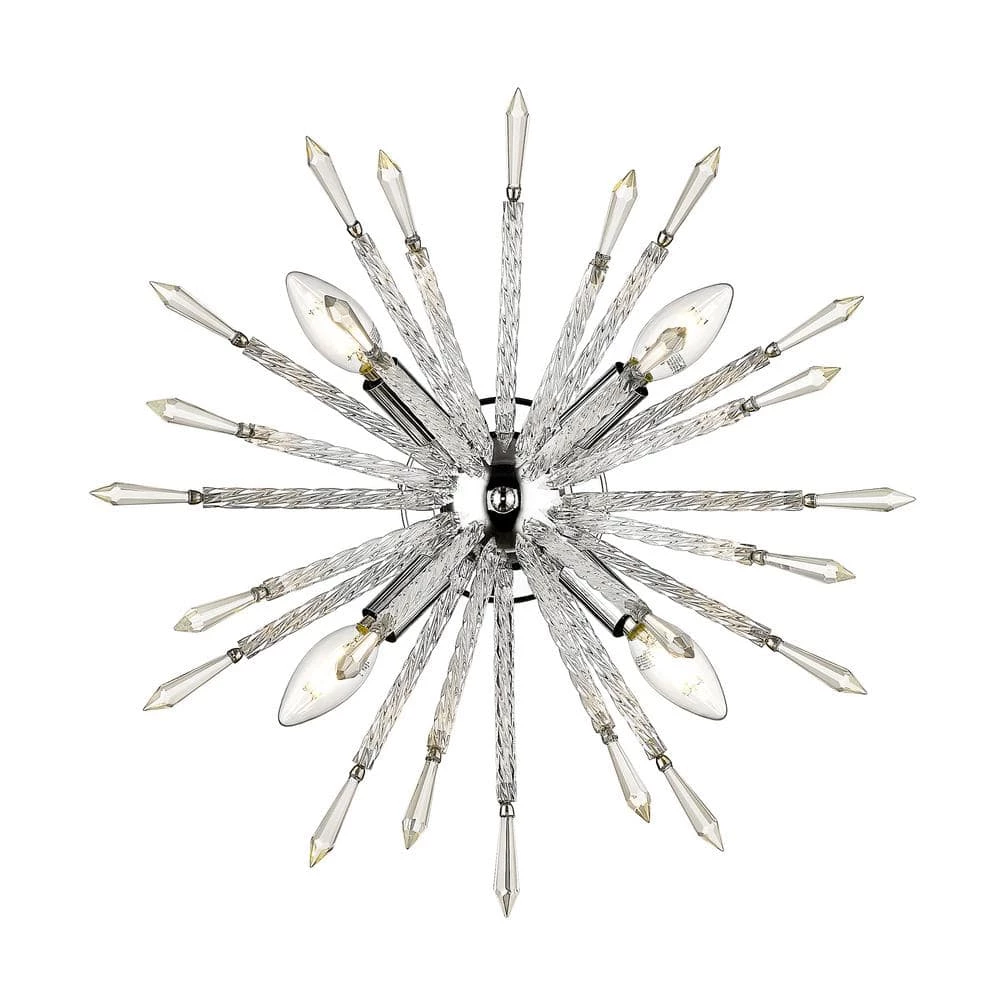 Draw all eyes to your wall with the dramatic dazzle and explosive impact of the Sputnik wall sconce by OVE Decors. This mid-century modern inspired fixture features radiating spokes of shimmering clear glass and chrome rods, accented by 4 soft white energy efficient LED bulbs. Perfect mounted in pairs to highlight a favorite work of art or to illuminate a wide hallway.
