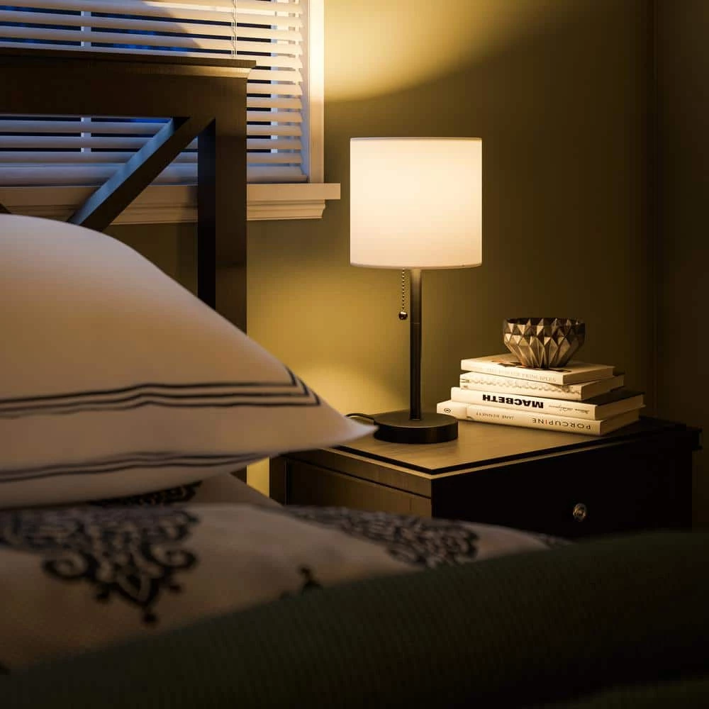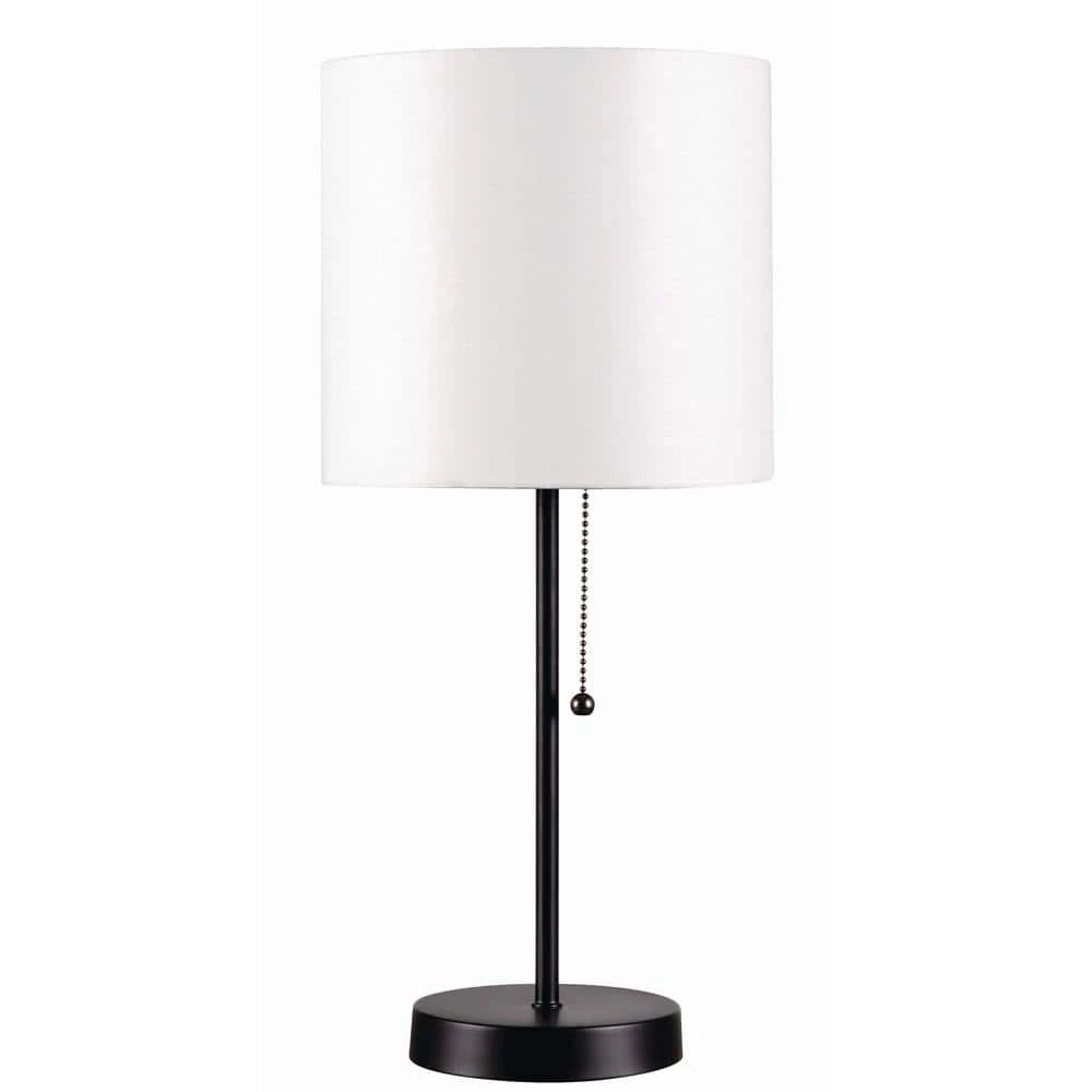 A tale of contrasts, this accent lamp combines a deep black finished base with a crisp white drum shade, packing huge amounts of style into a single small lamp. This stand-out accent creates a brightly diffused light perfect for your modern glass end tables. A retro pull chain switch breaks up the contemporary clean-lined look, adding interesting detail to this boldly designed accent lamp.