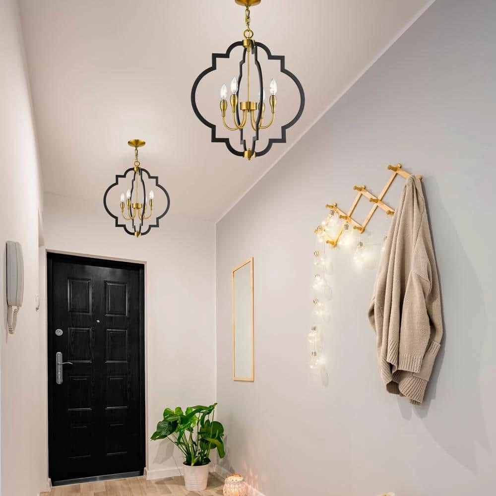 - Intricate quatrefoil shaped matte black frame design complements the antique gold chandelier within
