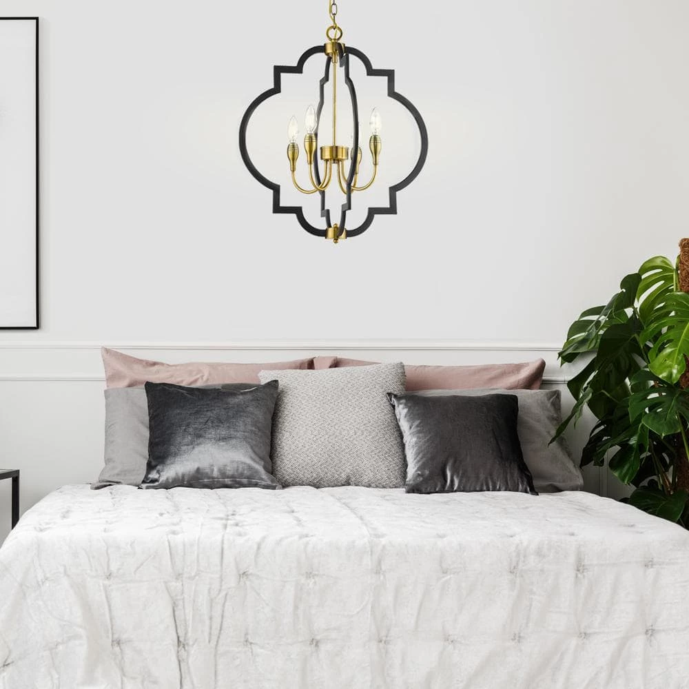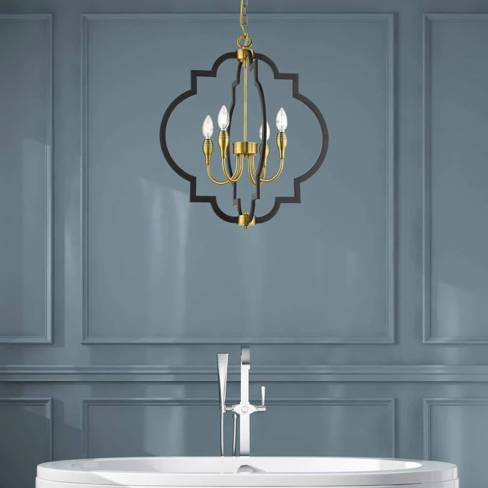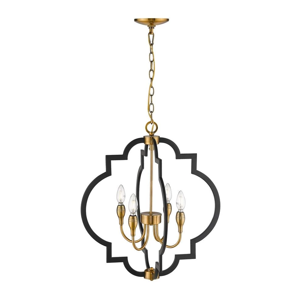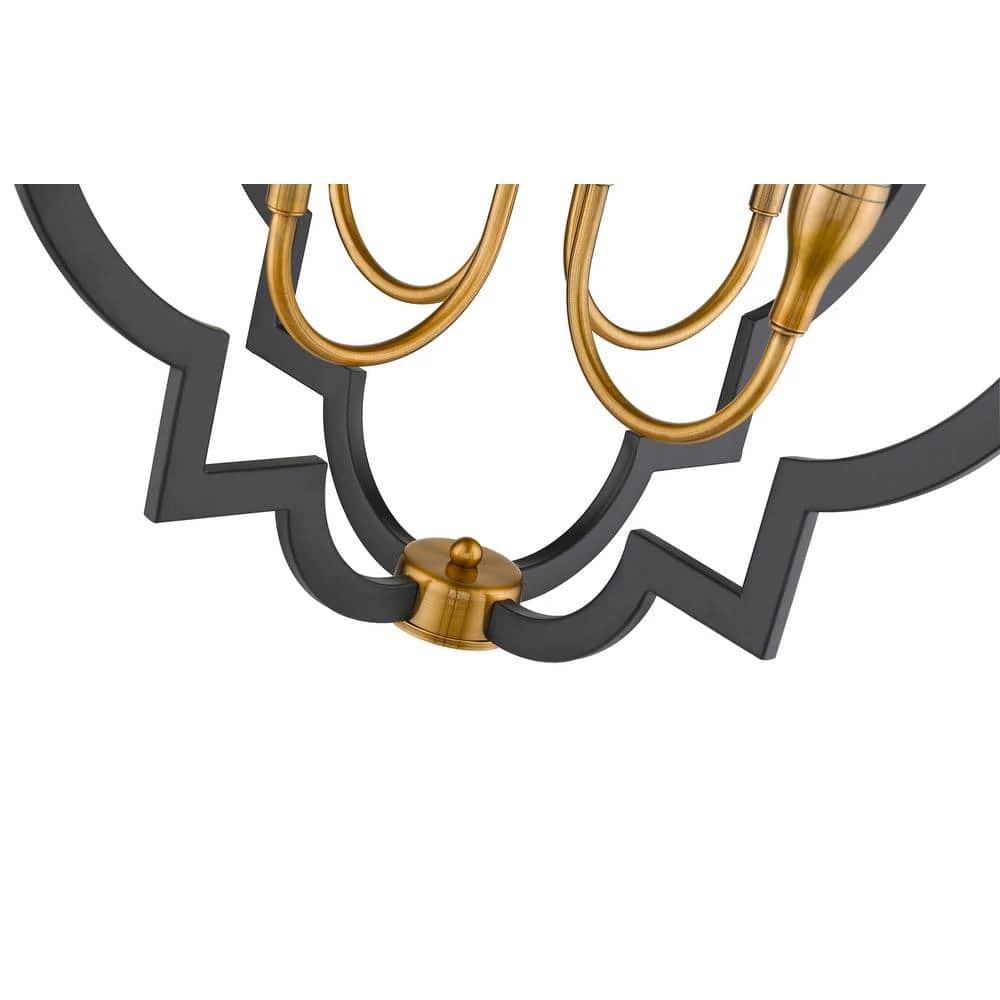 This stunning Alhambra inspired 21.63 in. wide chandelier by OVE Decors, with its interlaced iron matte black quatrefoil frame fashioned in that favorite four clover symbol of good fortune, takes pride of place in any design setting. Its burnished antique gold fittings and four arm chandelier adds an alluring glow over any room.