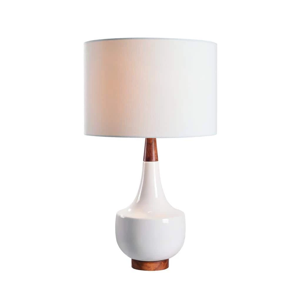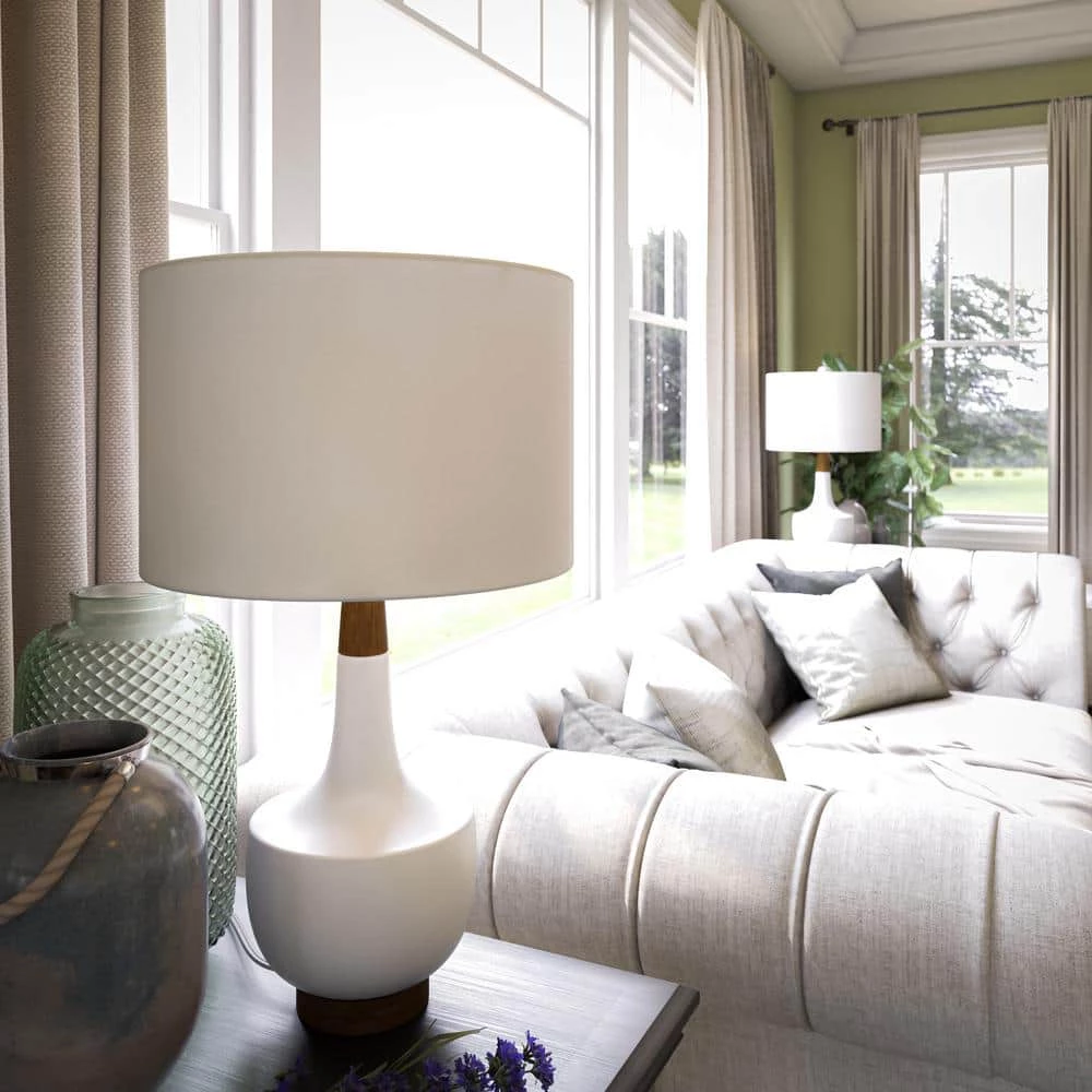 Sometimes a soft, organic touch is all that you need to tie a room together. With its white glossy ceramic, wood-finished accents, and crisp white cotton drum shade, this table lamp adds a natural accent to your modern living room. This lamp’s style is versatile to fit with any Mid-Century Modern, contemporary, loft or natural modern room with ease. Pair with greenery or a small succulent terrarium to highlight the wood grain finish, or pair with cozy textiles for a comfy hygge look in a Scandinavian style home. With 3-Way lighting and a stylish profile to boot, this lamp is the perfect transitional finishing touch for your ever changing home.