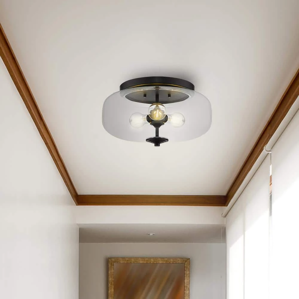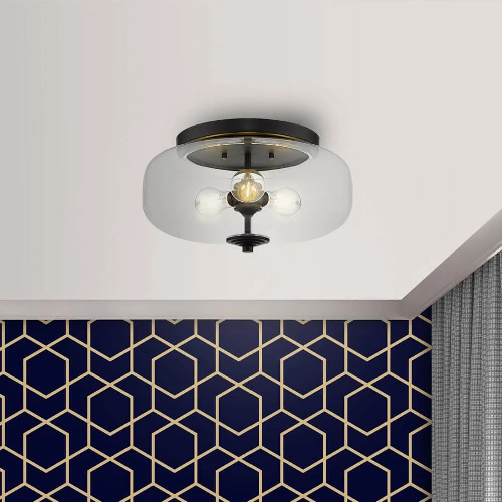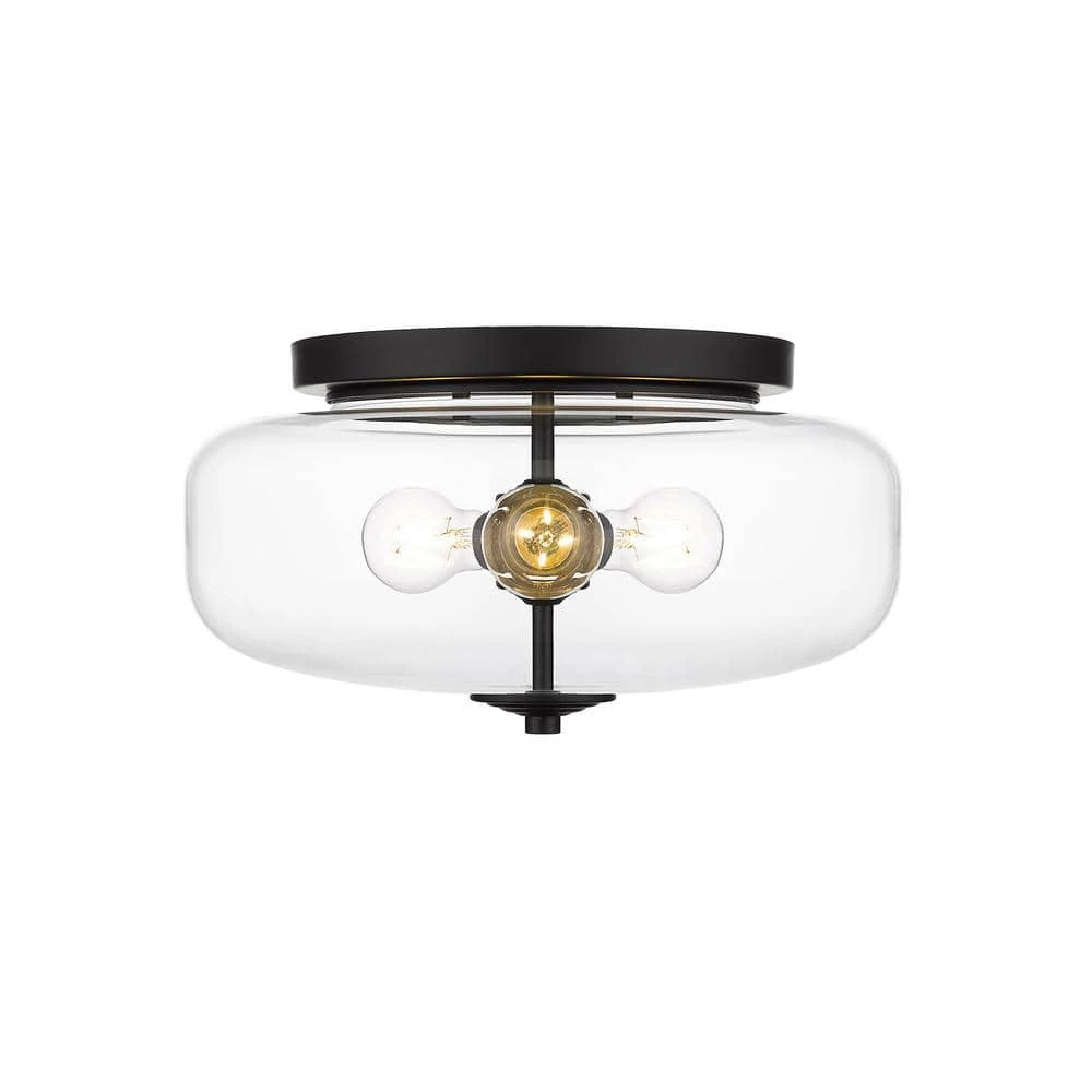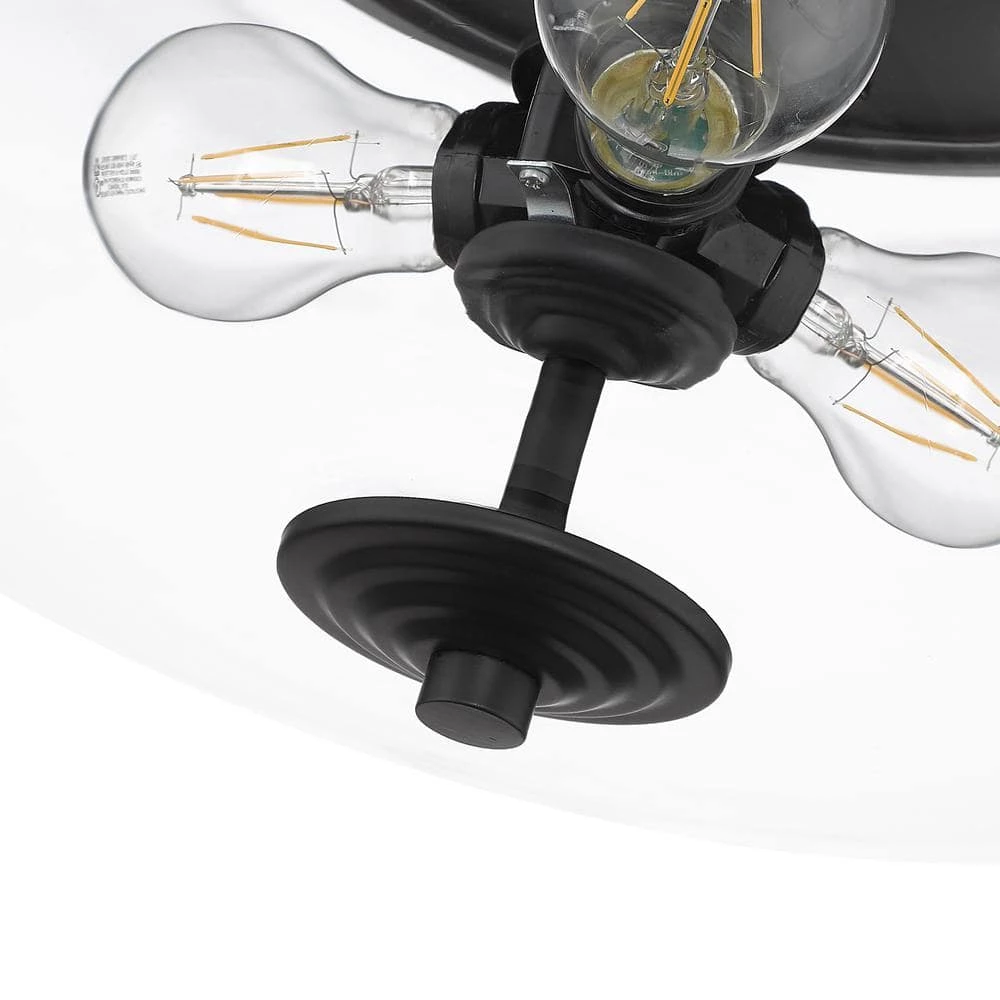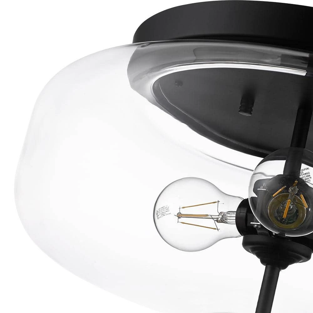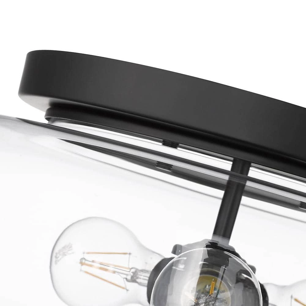 The Theodore flush mount ceiling light combines a transparent glass shade and 3 exposed LED bulbs with a smart black hardware finish, in effect creating a truly modern industrial-style design. Its circular mount and non-hanging design makes it easy to install in all locations. The fact that its light is distributed in multiple directions means that the Theodore works beautifully as a single central fixture or when installed in multiples.