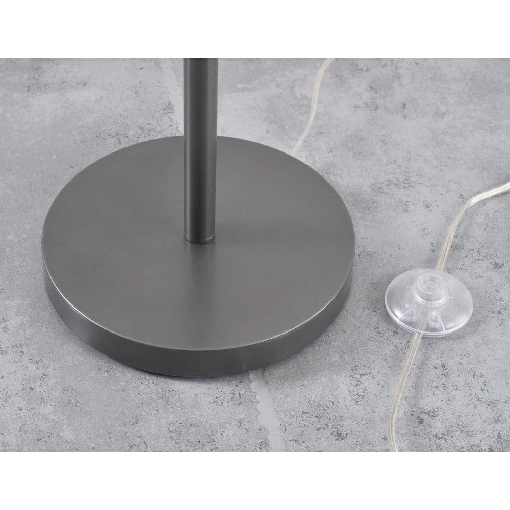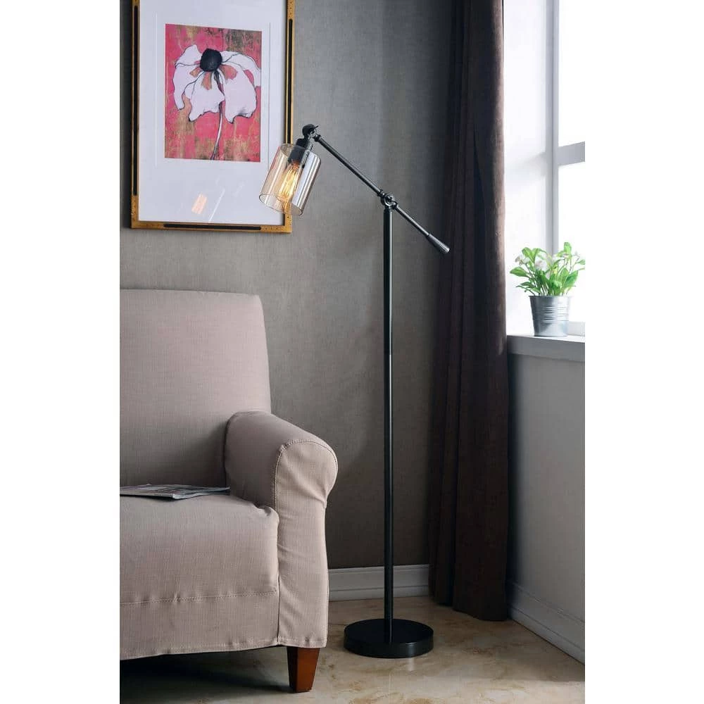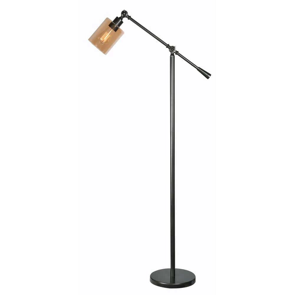 This stylish floor lamp is comprised of a knockout arrangement of mid-century modern style infused with industrial design sensibilities. Counterbalanced arms and industrially themed pivot points are used as the central design elements of the 57-inch tall floor lamp. This lamp is finished with warm bronze and iridescent amber glass shade, creating plenty of atmospheric lighting in your living room, home office, or master bedroom. The throwback vibe of the lamp is further stressed with the use of a warm vintage Edison bulb.