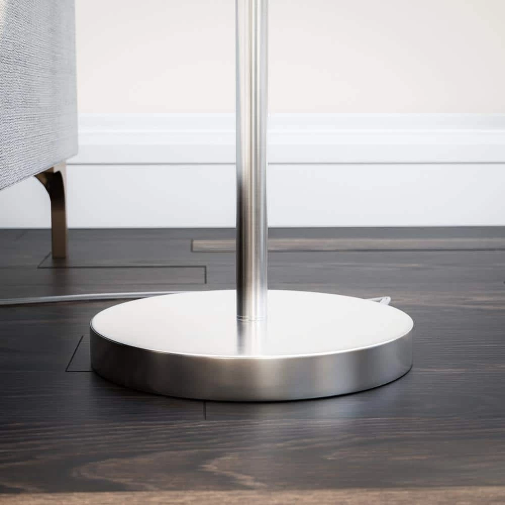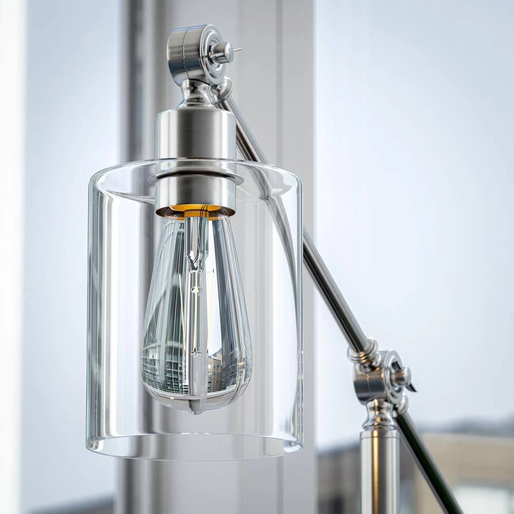 This stylish floor lamp is comprised of a knockout arrangement of mid-century modern style infused with industrial design sensibilities. Counterbalanced arms and industrially themed pivot points are used as the central design elements of the 57-inch tall floor lamp. This lamp is finished with a shimmering brushed steel and clear glass shade, creating plenty of atmospheric lighting in your living room, home office, or master bedroom. The throwback vibe of the lamp is further stressed with the use of a warm vintage Edison bulb.