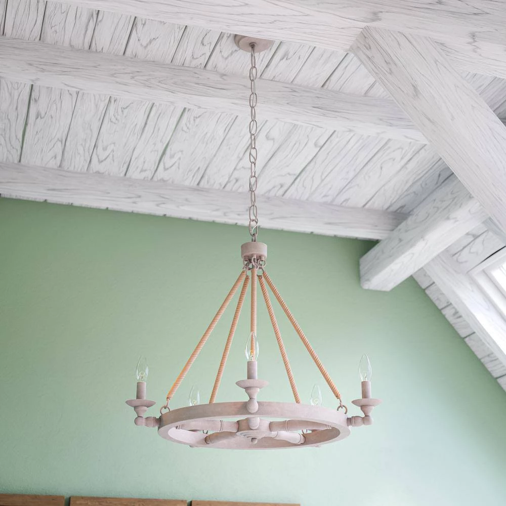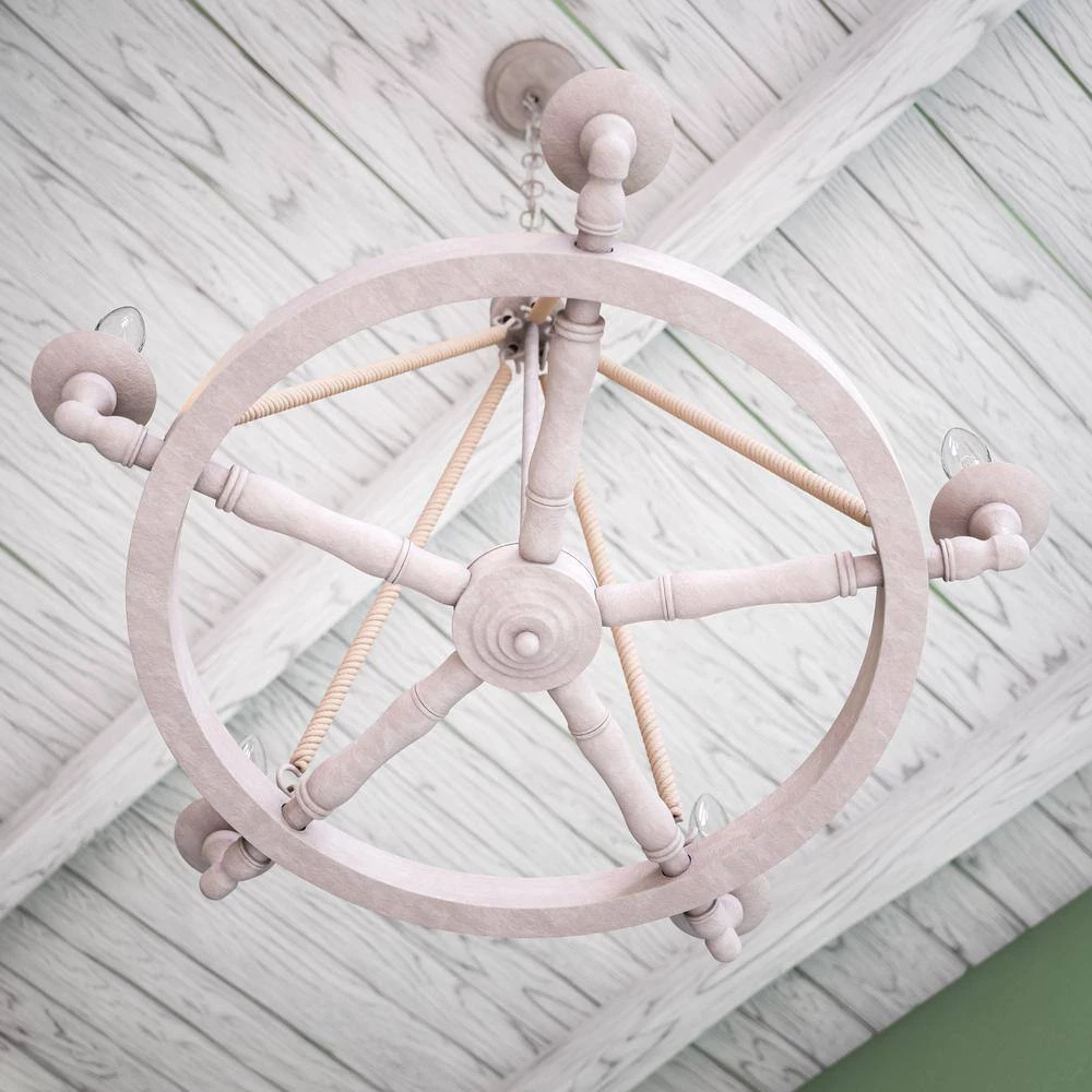 This nautical 5 light chandelier brings casual coastal charm to your beachside cottage. The chandelier’s main body has a ship’s wheel profile with a weathered white finish that brings a rustic touch to your home decor. Ropes hold the entire chandelier up, adding yet another nautical element that helps to tie a space together. This chandelier will be sea-worthy hanging over your dining room, living room, or entryway – perfect for rustic cottage chic home decor.