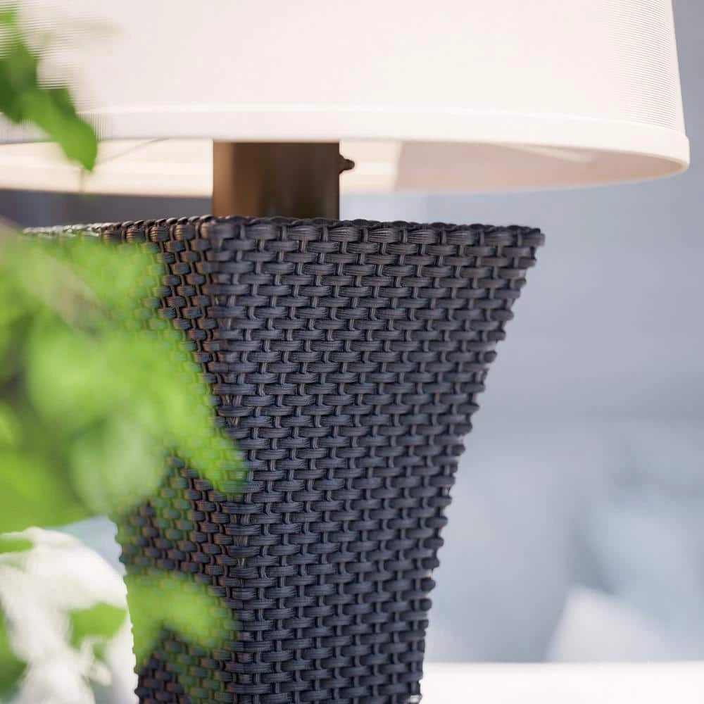 - Contemporary outdoor tall table lamp with bronze and rattan woven body