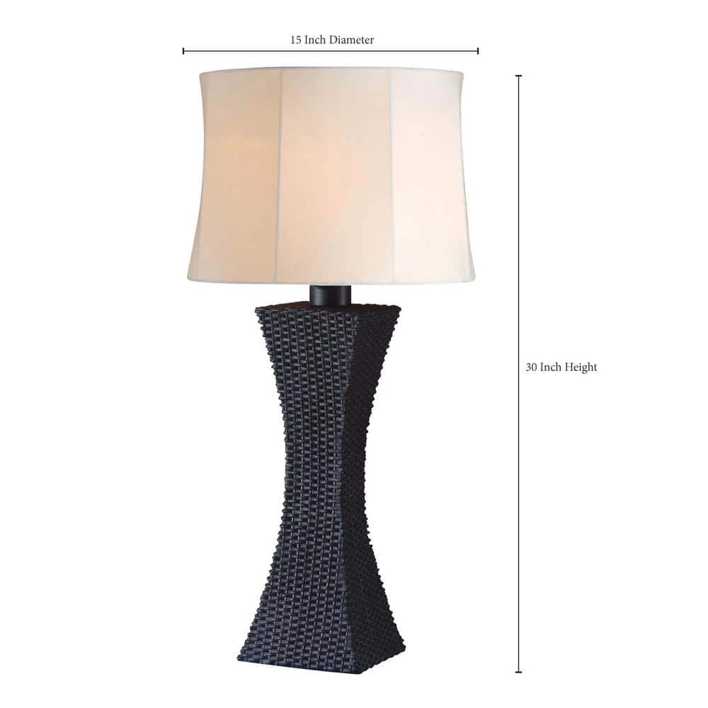 This contemporary curved table lamp is an exceptional example of taking tried-and-true interior lighting design styles and translating them for outdoor use. An elegant woven rattan texture gives this lamp a modern twist, while its dark curved body is beautifully complemented by a paneled cream shade. While gorgeous enough for indoor use, this outdoor table lamp features water-tight seals in the bulb shield and features UL approved switches that are safe for use in wet and damp outdoor locations – perfect for use as a charming modern accessory on top of patio tables in your outdoor living room.